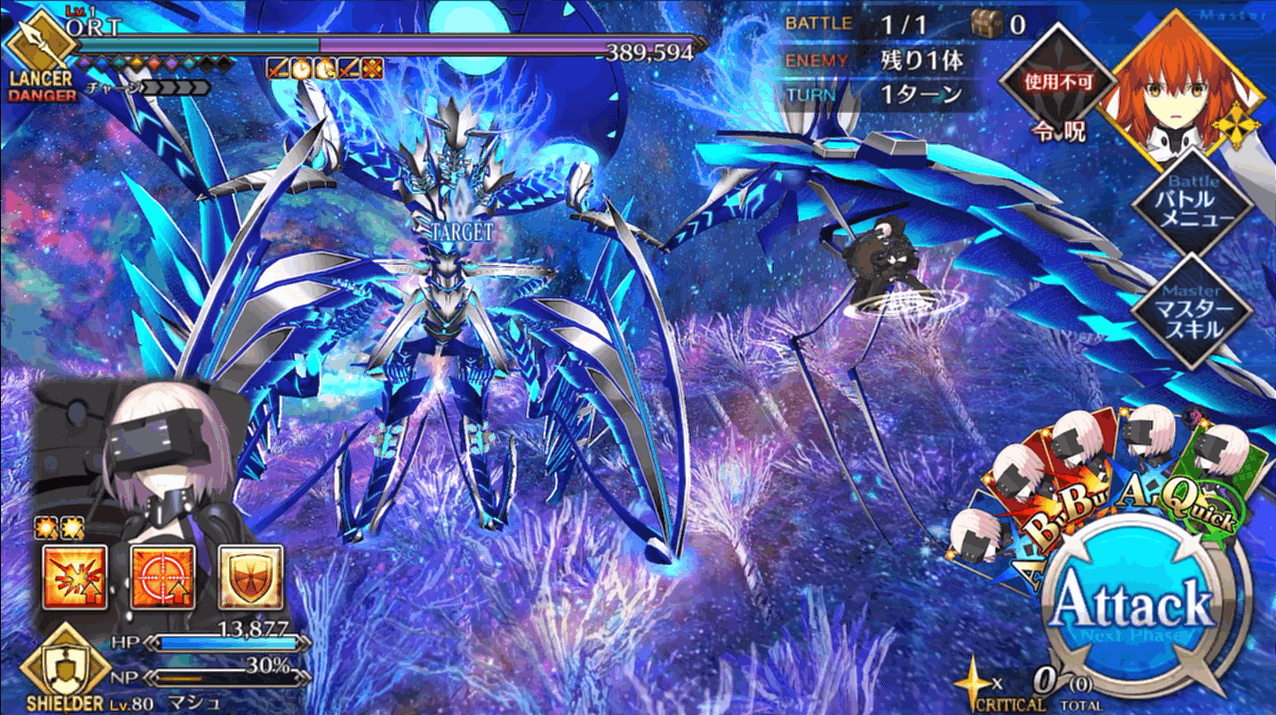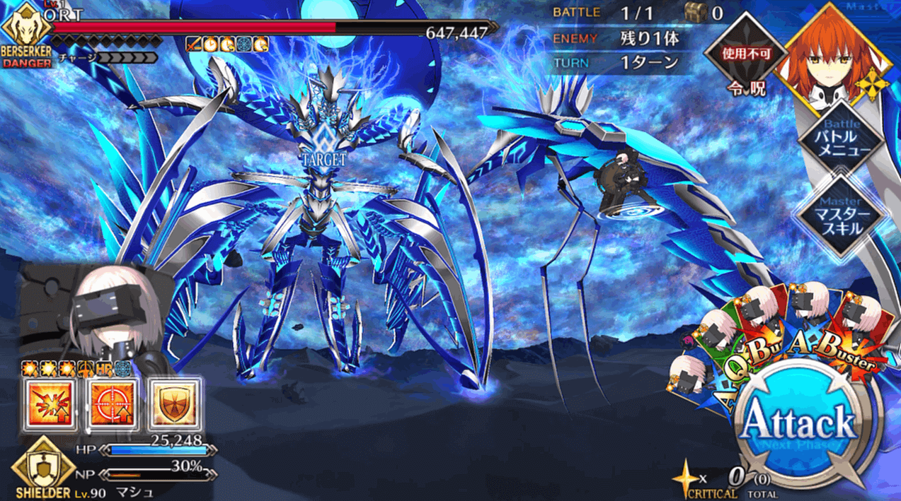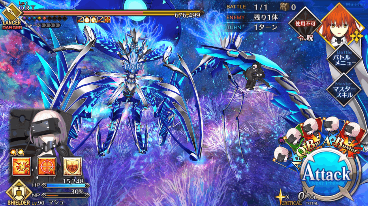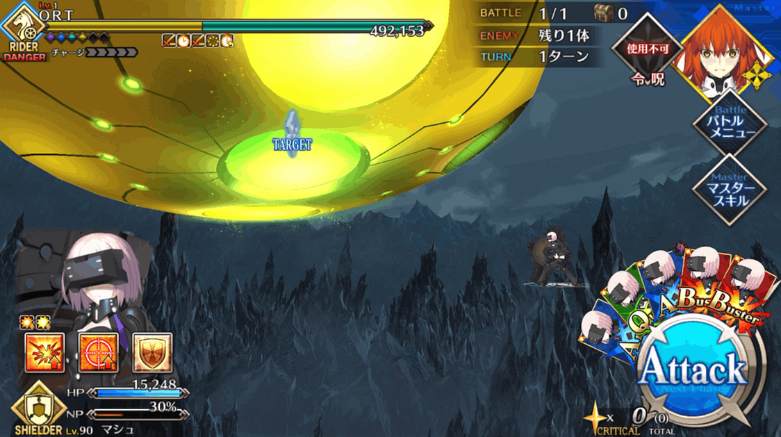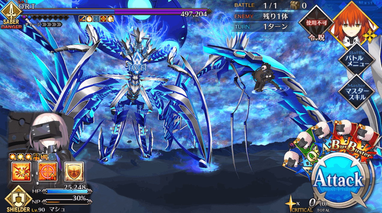 一度出撃したサーヴァントは再出撃できないので、16本のゲージを分散して削ります。ただし、マシュは一度出撃しても、他のサーヴァントで4回挑戦した後に再出撃可能。再出撃可能になったマシュをやりくりするのが、戦力不足のマスターがORT総力戦を突破するコツといえます。