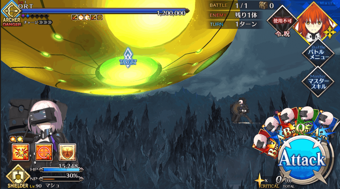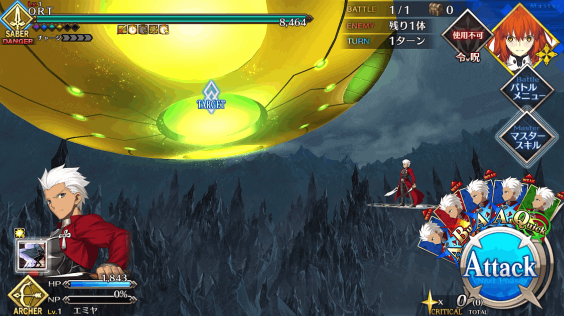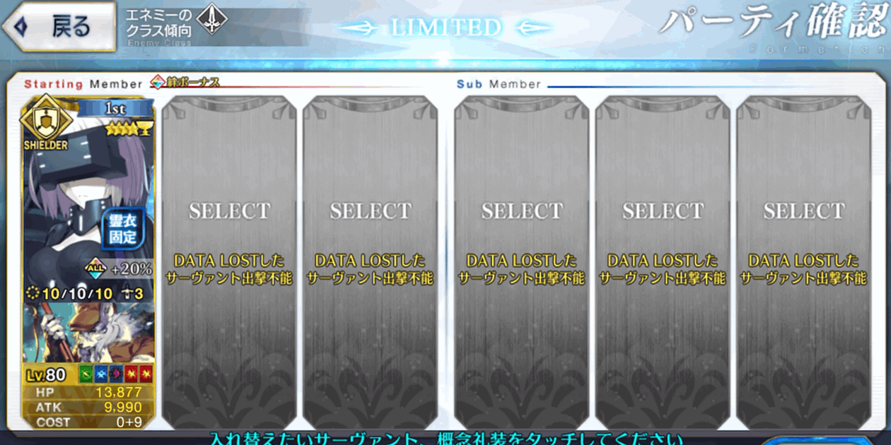 チュートリアルガチャで入手していた星4のエミヤを出撃させている。レベルはLv1のみ育成であるため、他の低レアサーヴァントがいれば代用可能だ。