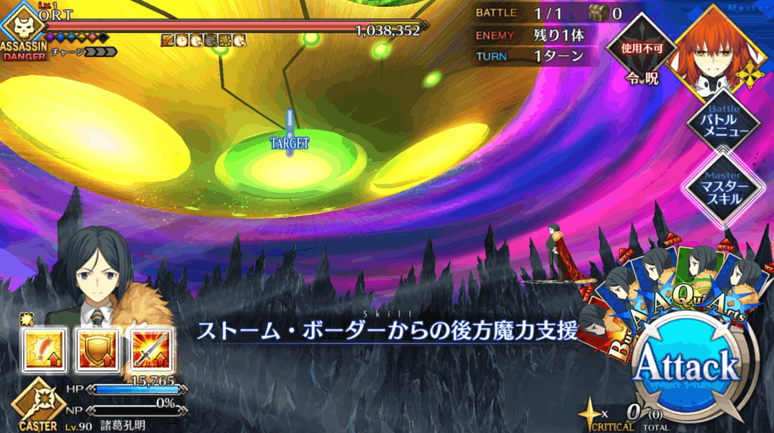 星5キャラ1騎は、冬木クリアで可能になる「特別召喚」で手に入るため、検証では諸葛孔明を出撃させています。諸葛孔明は攻撃宝具を持たないため、通常攻撃メインで立ち回らせています。