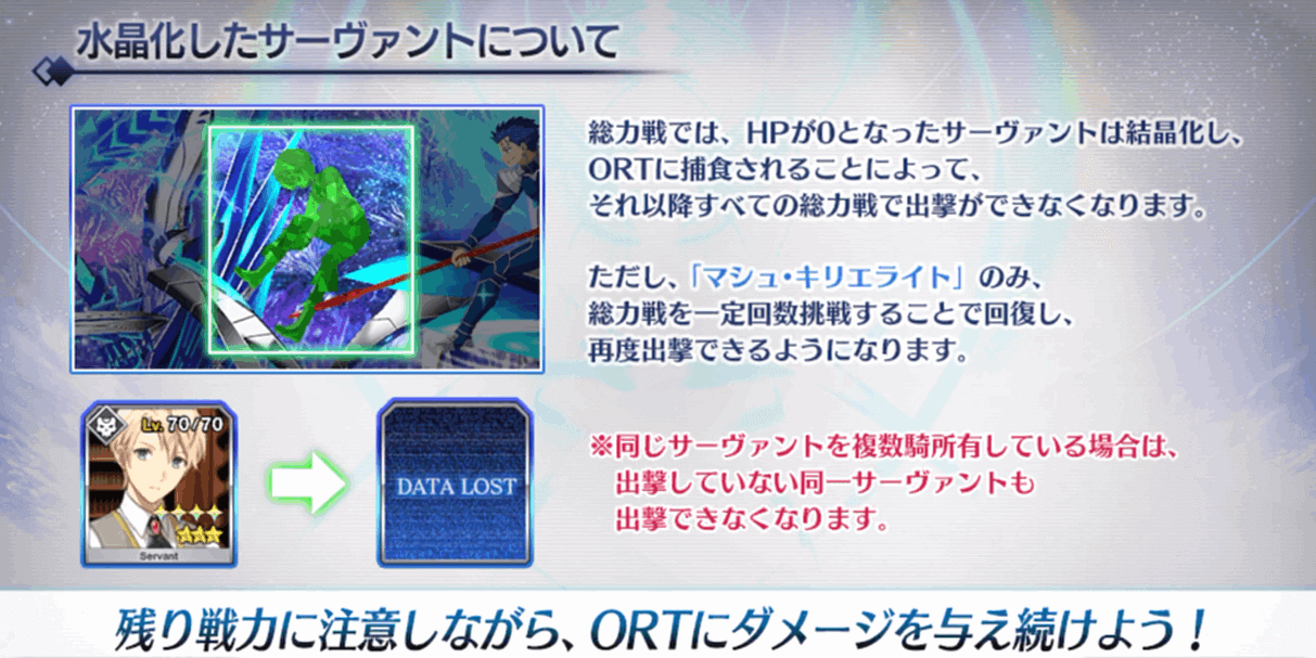 ORT総力戦ではスタメンをすべて埋めずに、1騎のみでも出撃可能。そのため、サーヴァント1騎でゲージ1本を確実に削るのであれば、再出撃可のマシュをあてにしない場合でも、理論上最低16騎で攻略できます。実際はクラス変化や手持ちの状況によるので、30騎程度育成しておけば十分ともいえます。