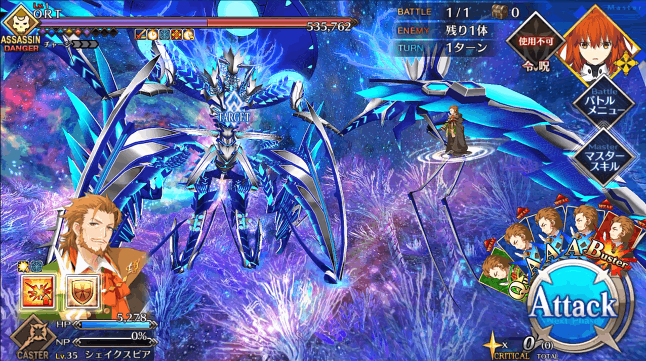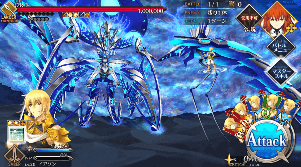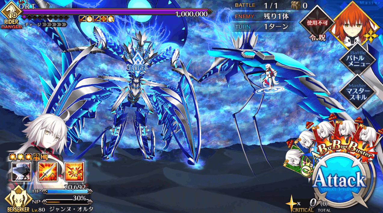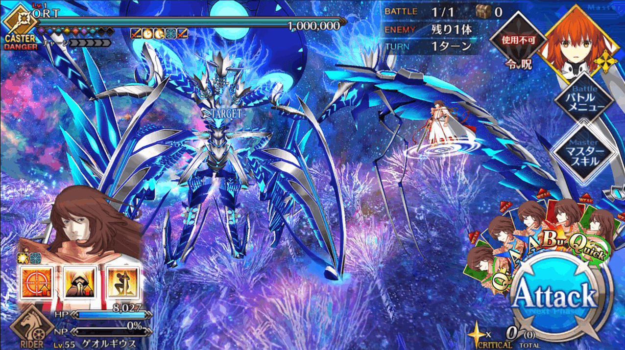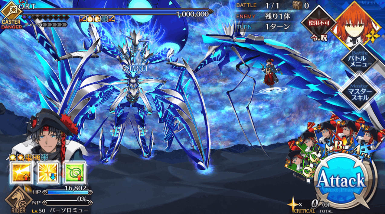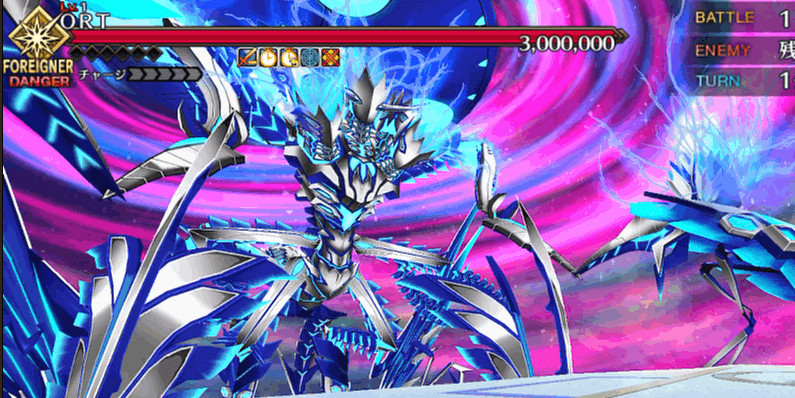 HP300万のORT戦はこれまでの出撃制限が解除され、好きなサーヴァントを編成できる通常戦。1ターン毎にクラスが変化したり、確率強化解除したりと難易度は高いものの、約100万程度はギミックで減らしてくれるので、マスターは残り約200万を削ればOK。石コンテも可能なので、ゴリ押しで終わらせることもできます。