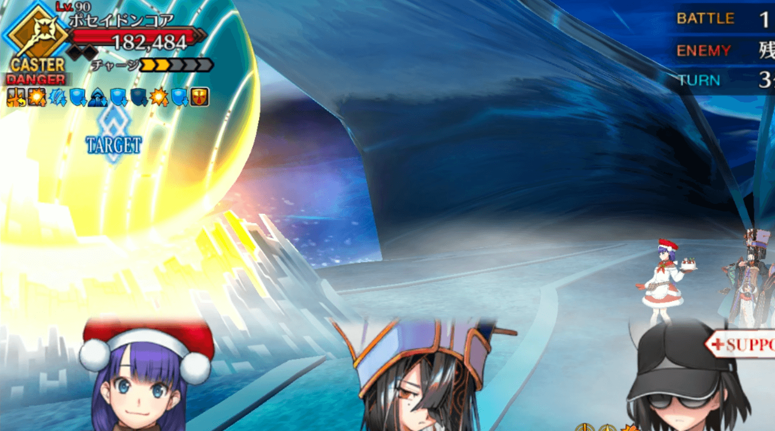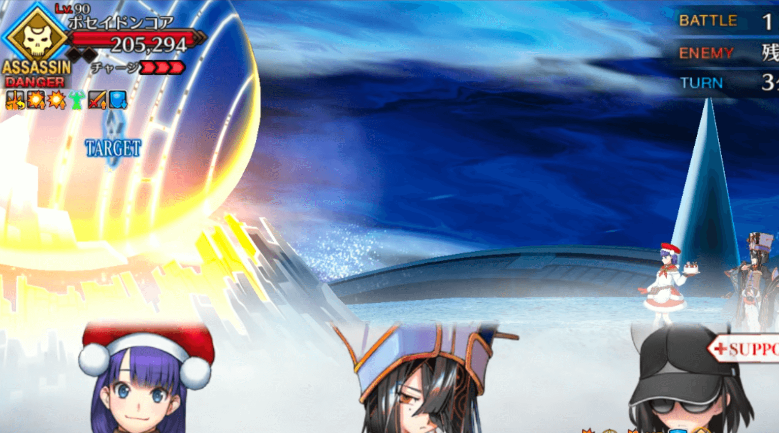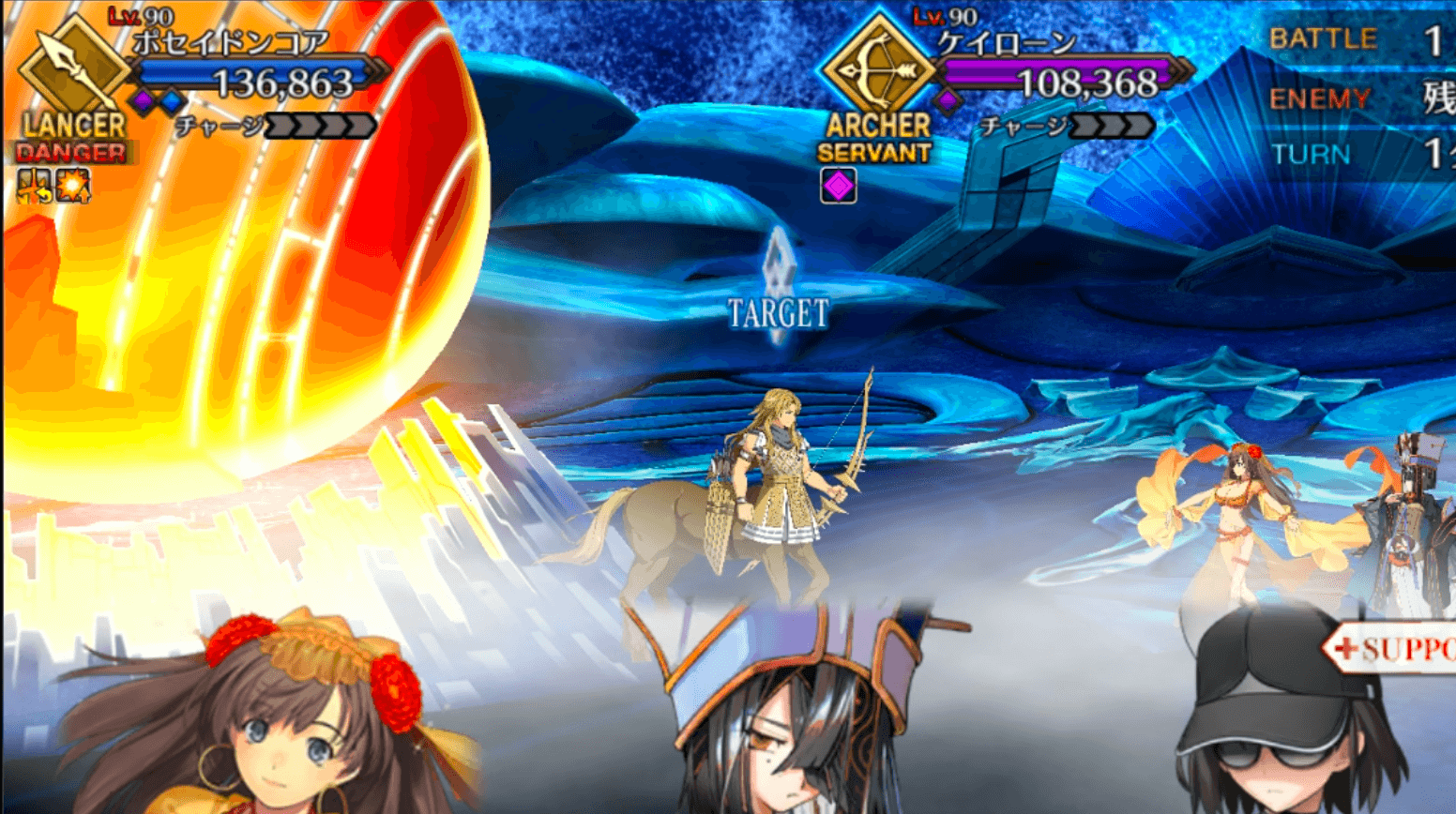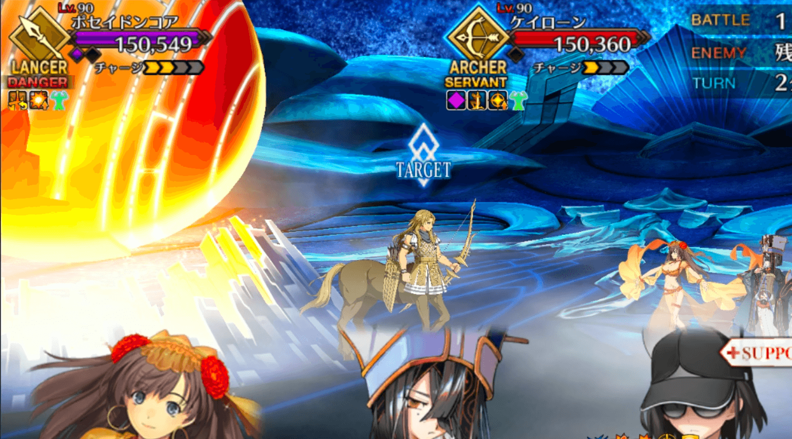 敵の全滅でクリア。ポセイドンは毎ターンチャージが1増加する。ケイローンは生存中、さまざまなバフを全体に配り、ブレイク後は自身にガッツを付与するため非常にしぶとい。