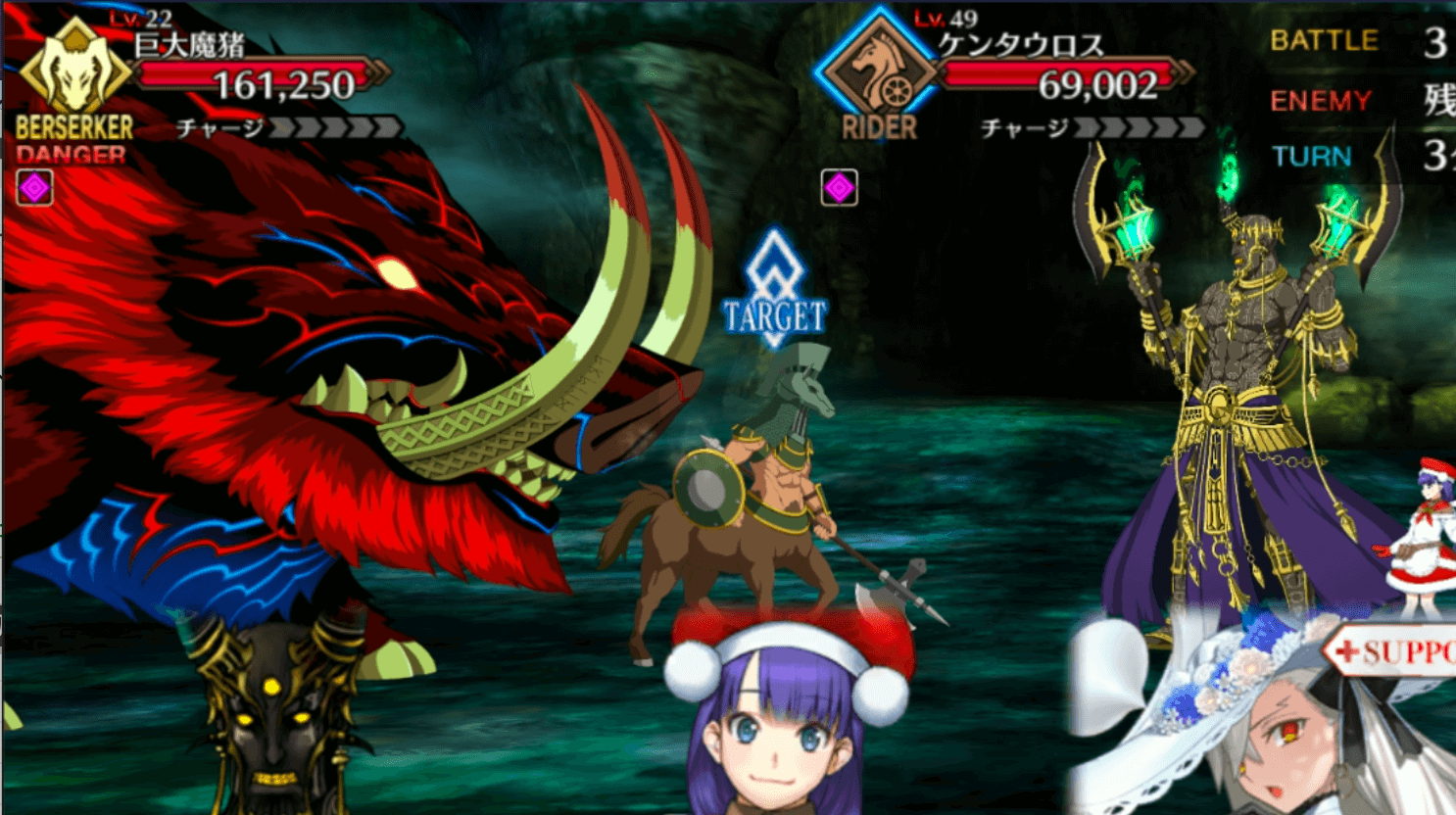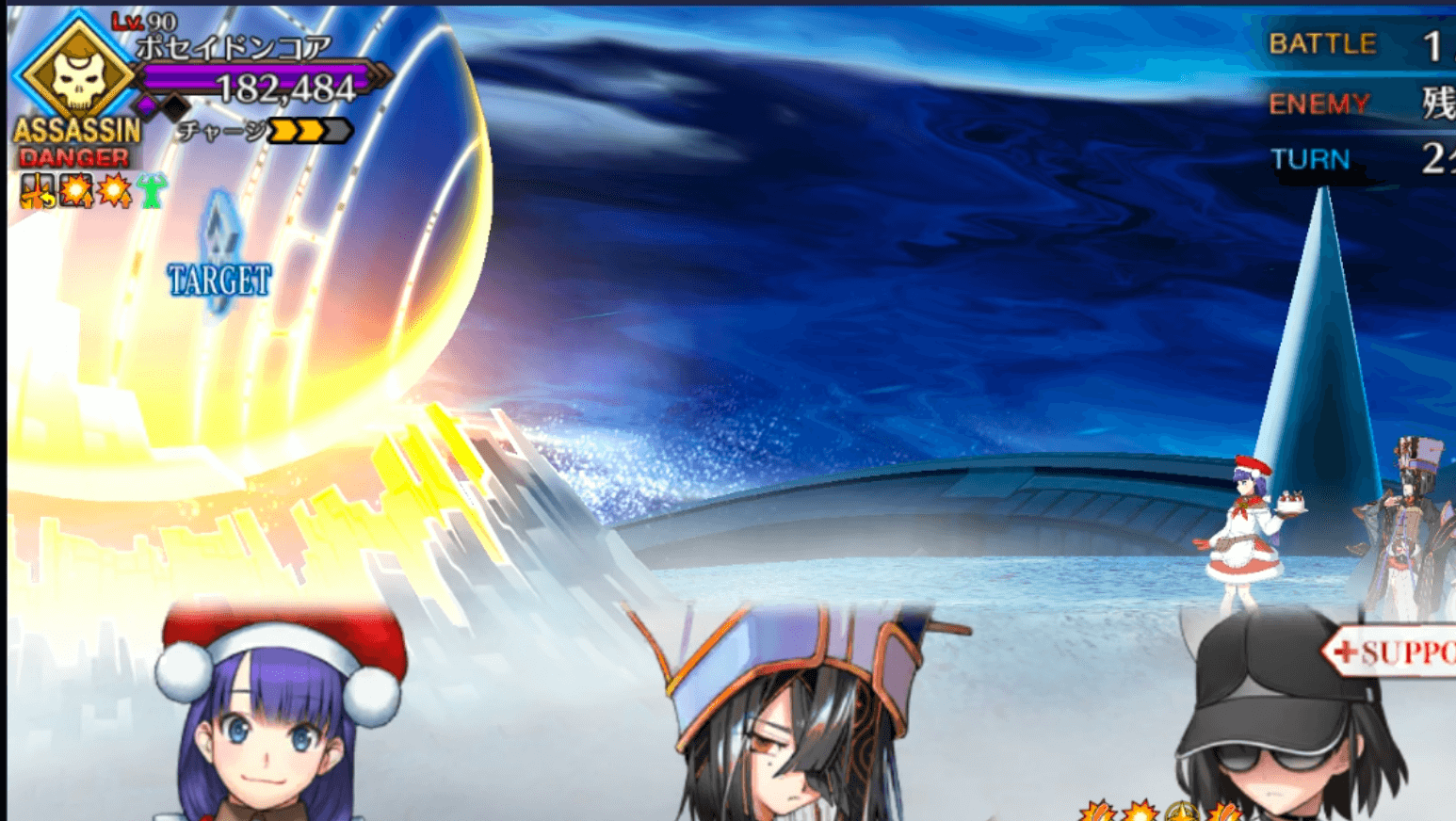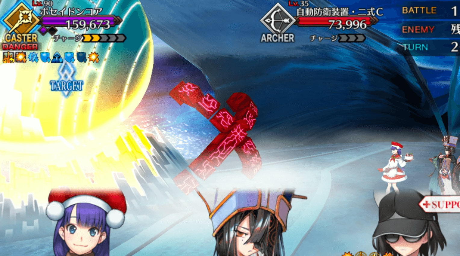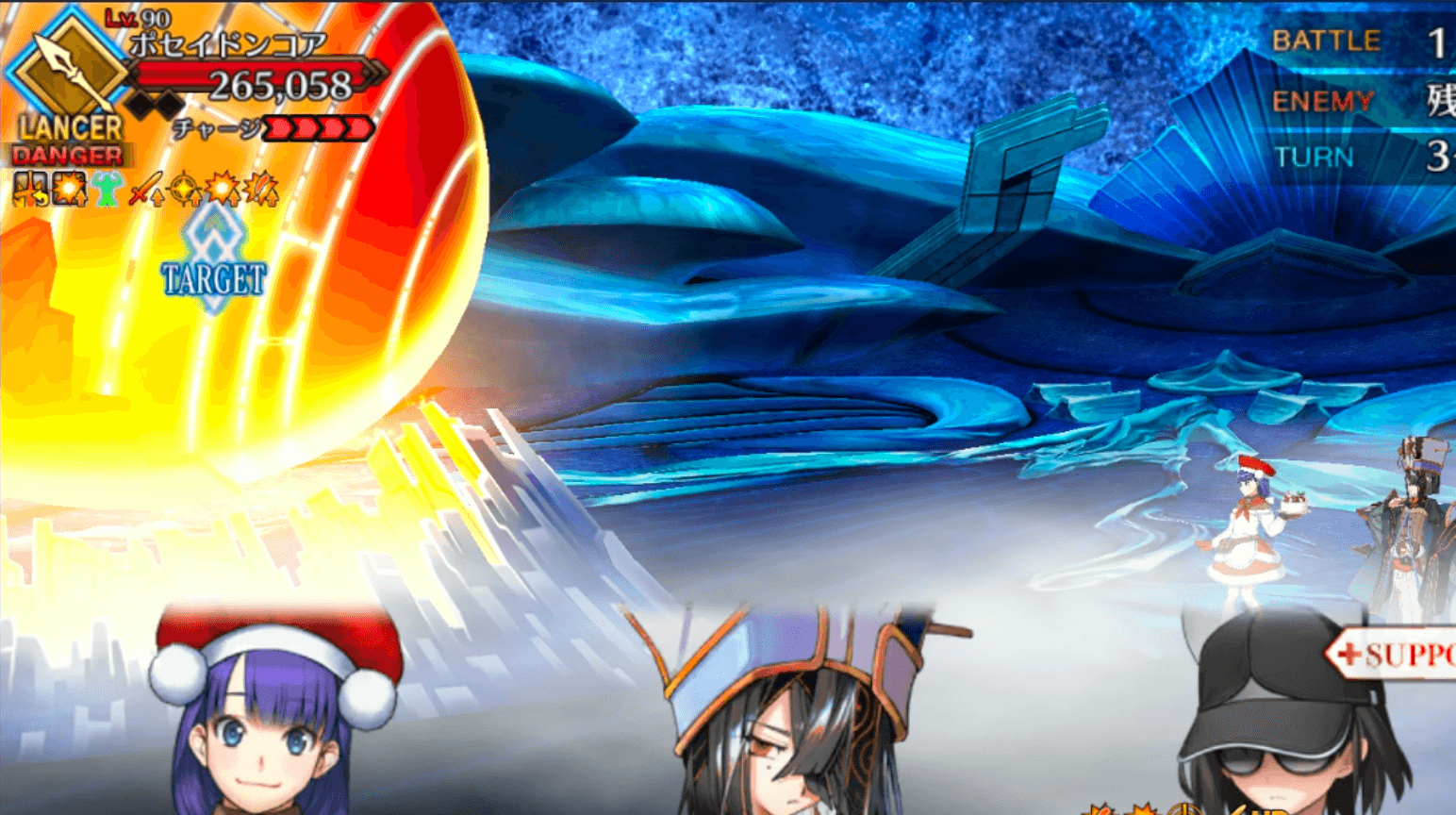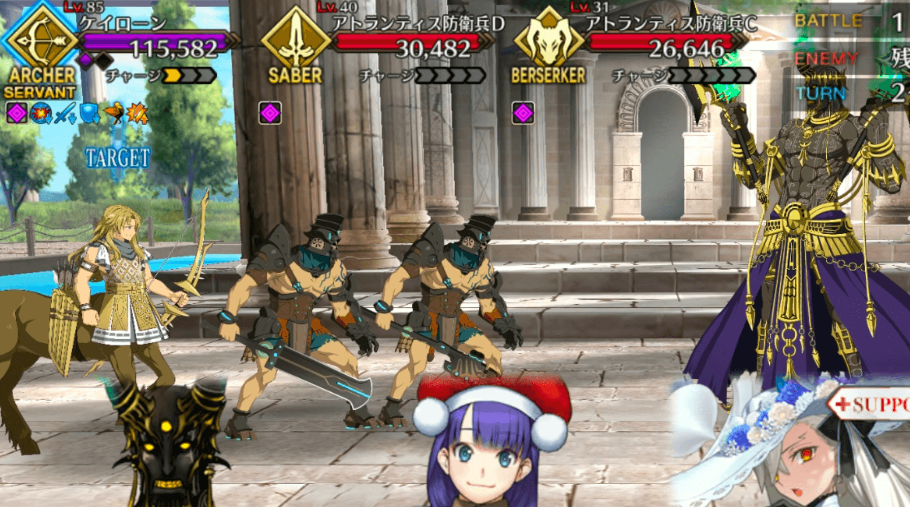 敵の全滅でクリア。ポセイドンは毎ターンチャージが1増加する。ケイローンは生存中、さまざまなバフを全体に配り、ブレイク後は自身にガッツを付与するため非常にしぶとい。