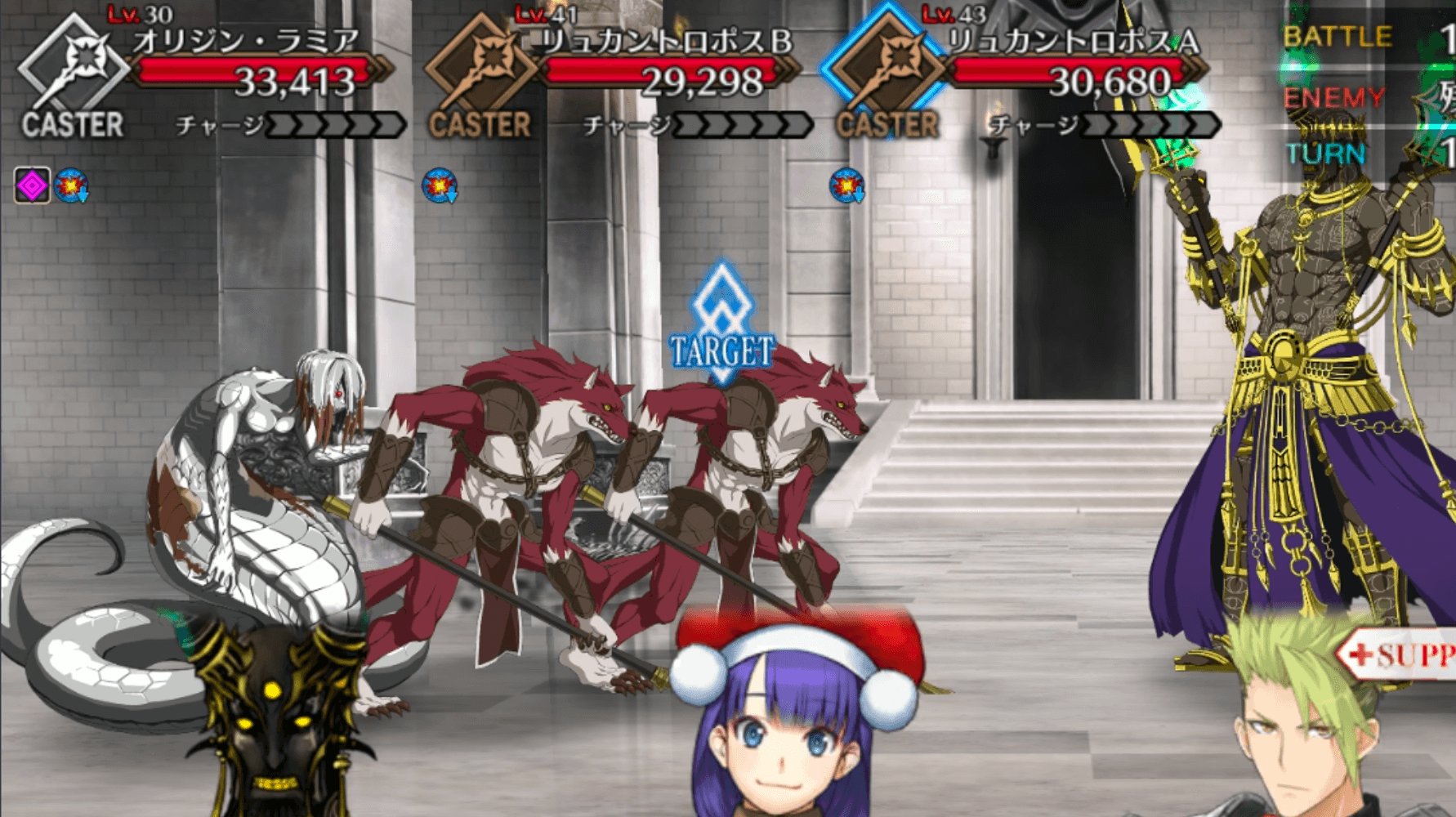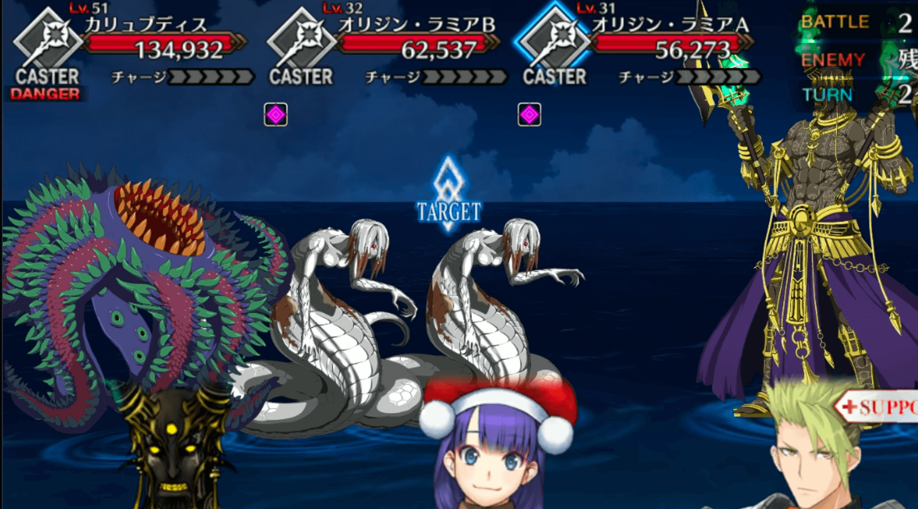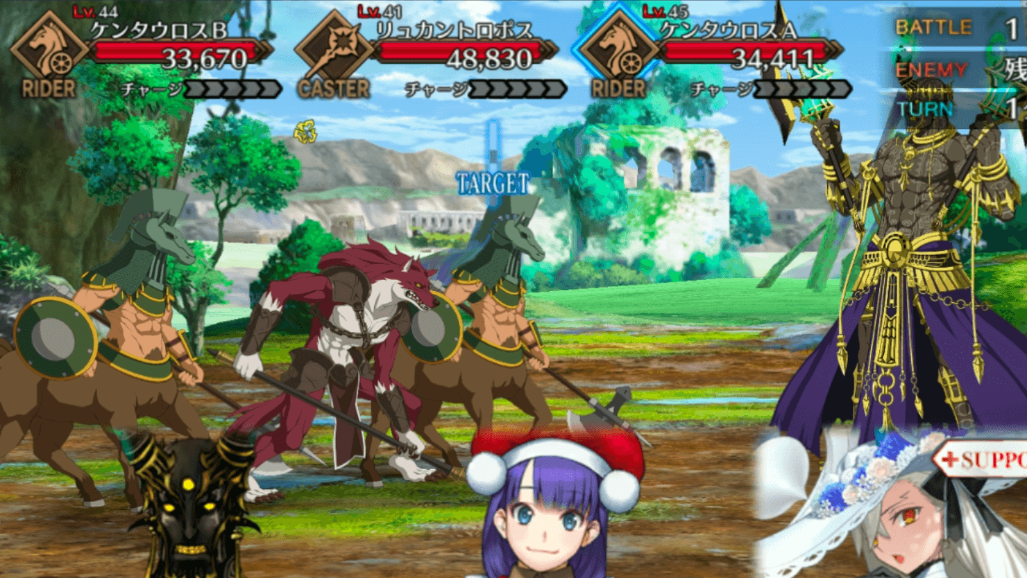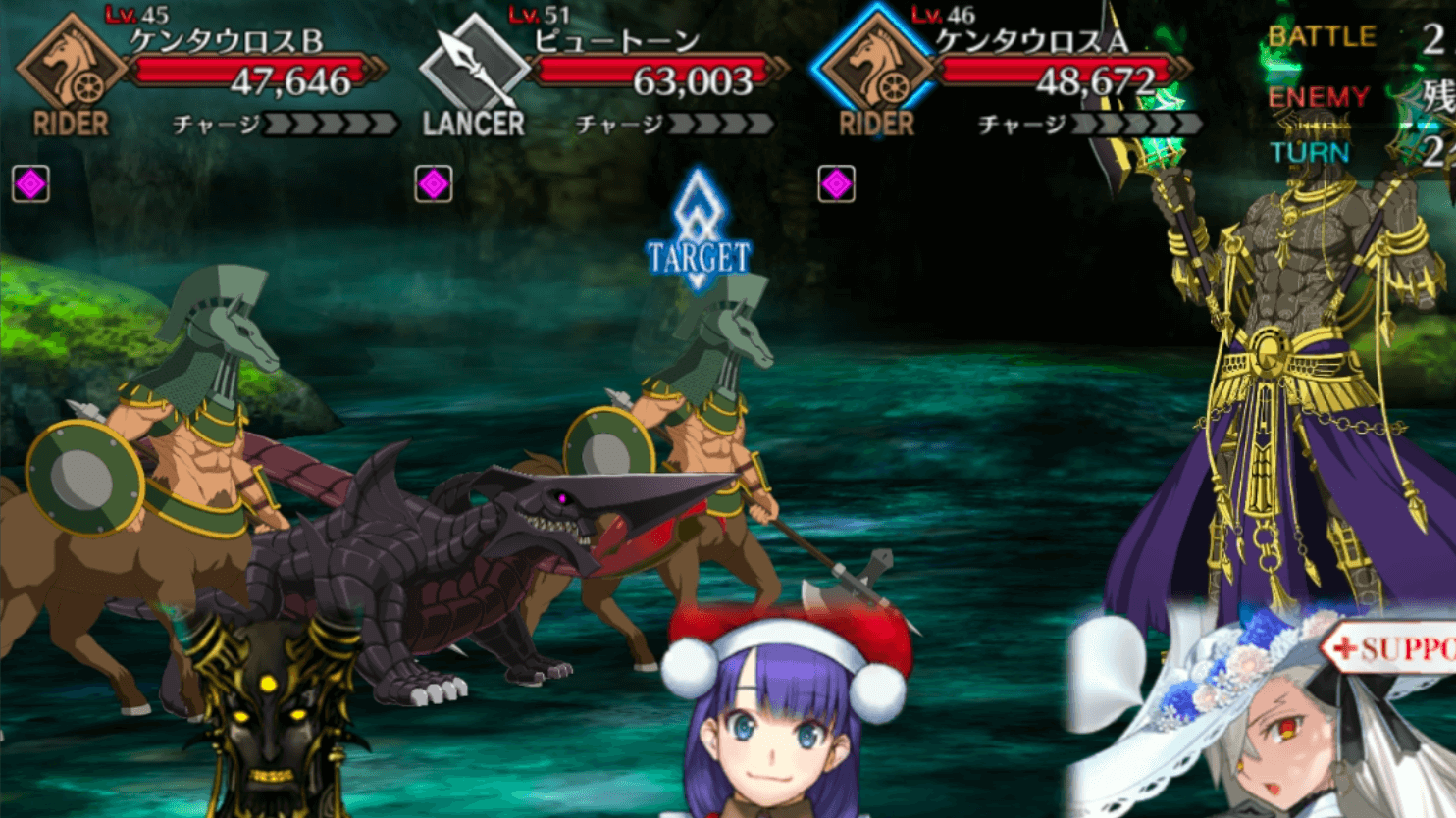 敵の全滅でクリア。ポセイドンは毎ターンチャージが1増加する。ケイローンは生存中、さまざまなバフを全体に配り、ブレイク後は自身にガッツを付与するため非常にしぶとい。