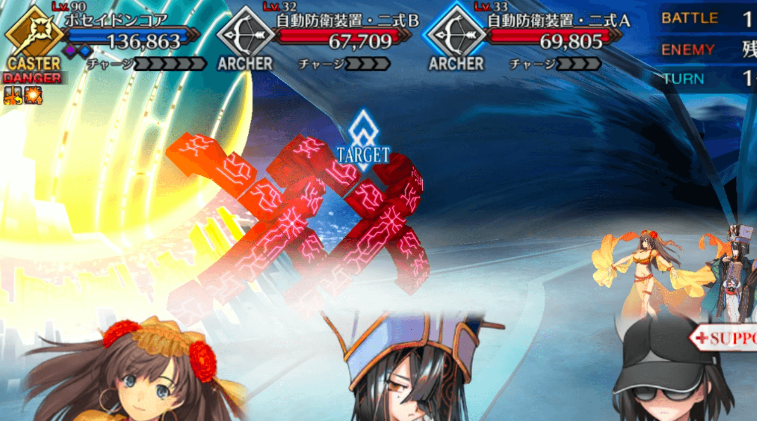 ケイローンもポセイドンコアも天属性であるため、前回同様に天特攻を持つ玉兎をアタッカーにすると良い。ただし、敵の総合HPが高くチャージ攻撃を受けた場合に前衛が瓦解する場合がある。玉兎が撃破される場合に備えて、控えにセイバーのアタッカーを編成しておくと安心だ。