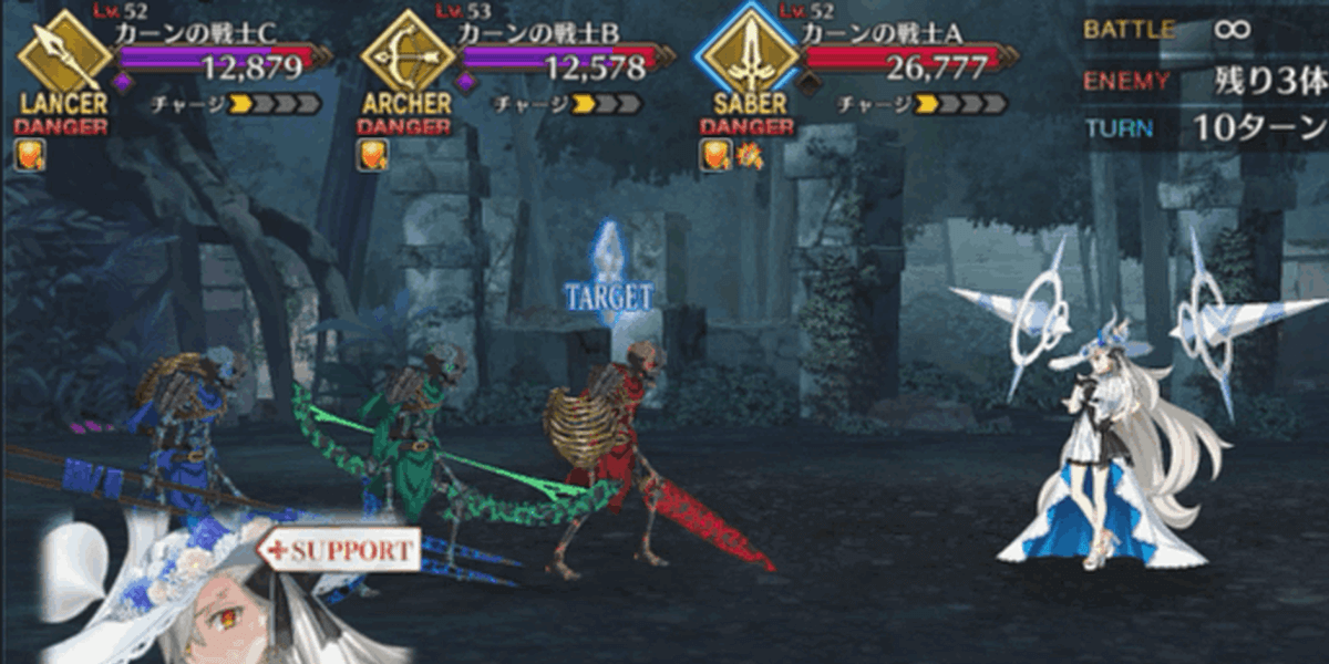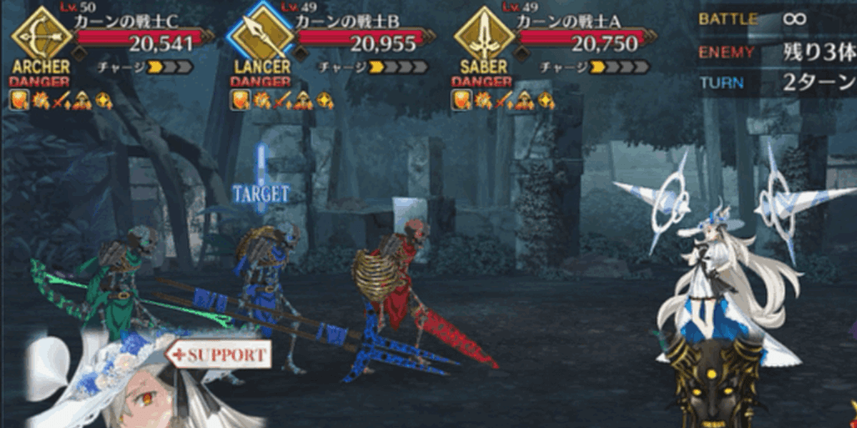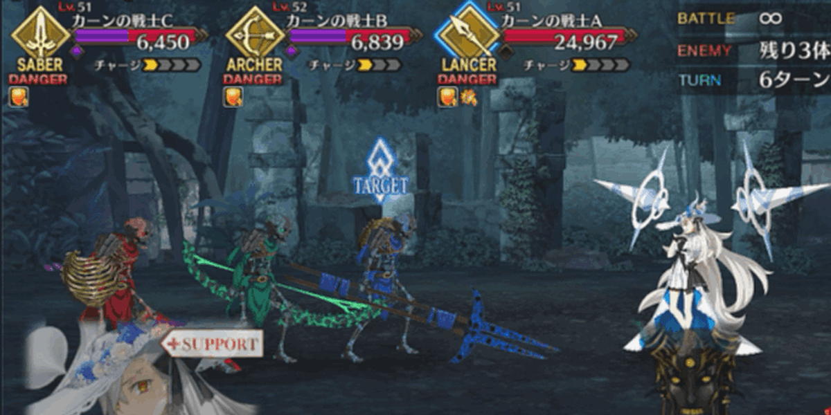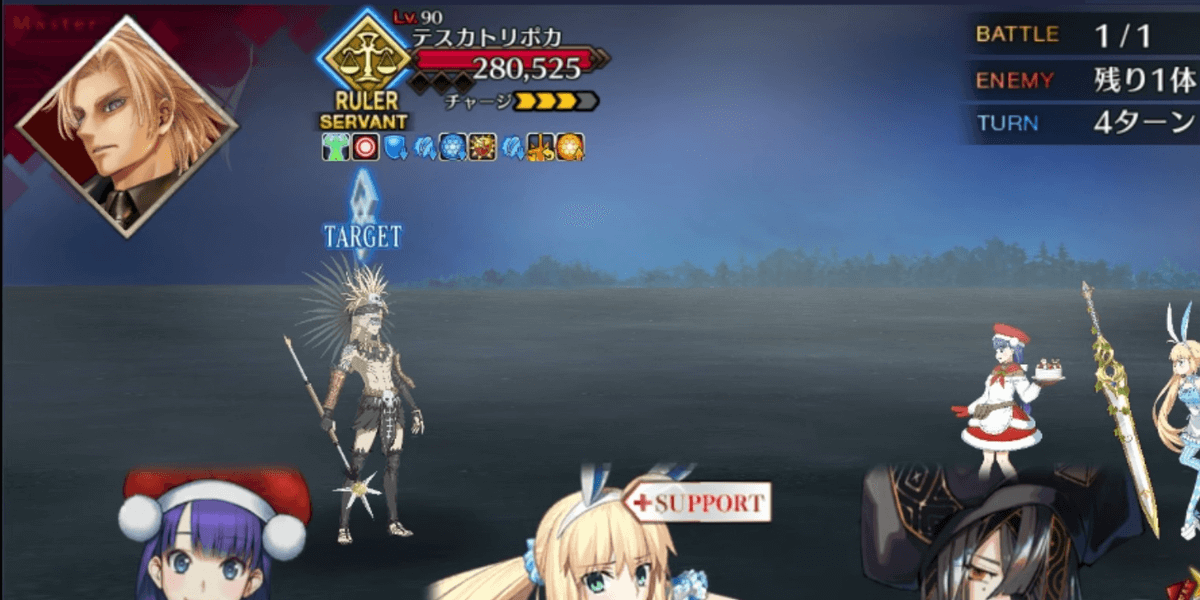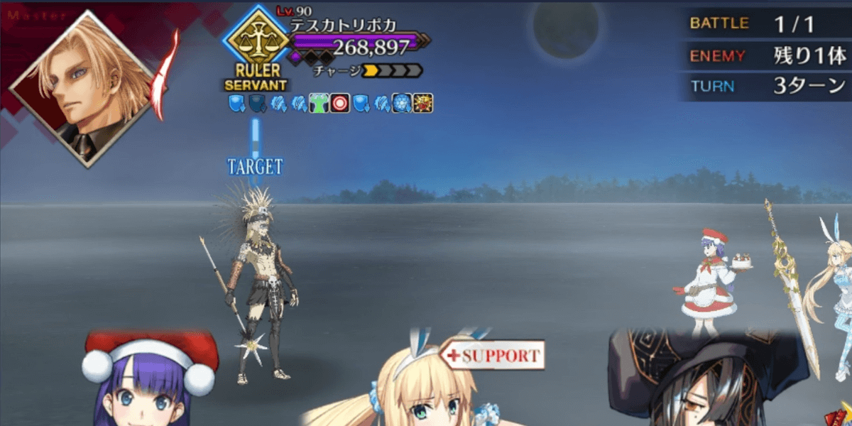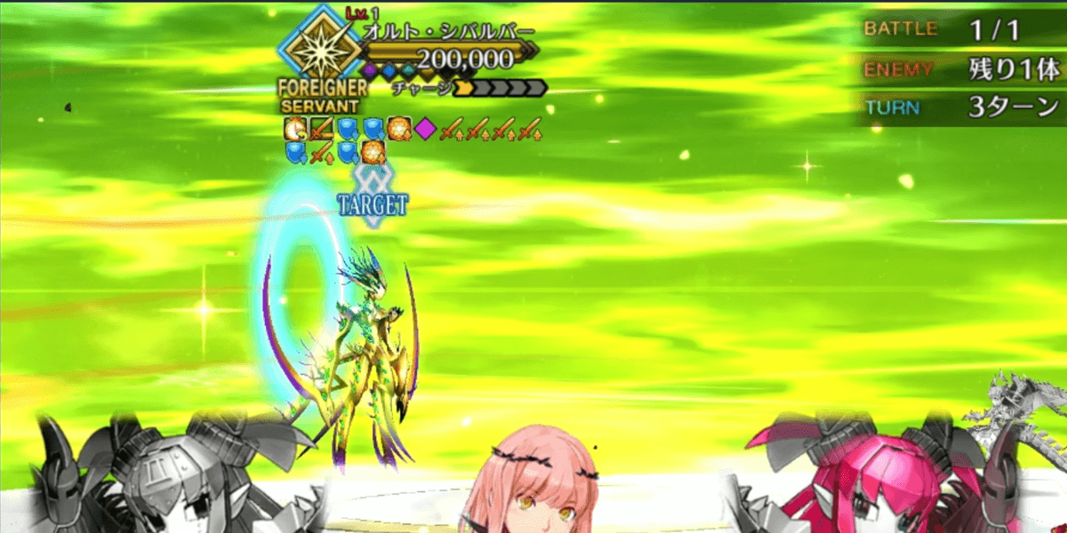 HPゲージ7〜11本目は、低レアサーヴァント中心で挑もう。中盤限定で「最大HPアップ(1万)」「攻撃威力アップ(50%)」「NP獲得量アップ(50%)」が、出撃サーヴァントに付与されるため、低レアかつ低レベルのサーヴァントでも複数ターン生存し、ダメージを与えられる。