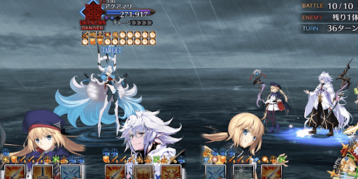 アクアマリーはアーツ被弾で自身が防御力アップ、バスター被弾で敵にNP獲得量ダウンを付与と厄介な状態なため、クイック攻撃を重視して攻撃していった。クイックで攻撃するとアクアマリーのHPが毎ターン2万回復するが、防御力アップやNP獲得量ダウンに比べると軽微だ。