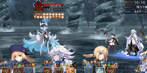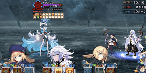 | 攻撃手順・攻撃ターゲットはタイダルストーム ・蘆屋道満→水着ワルキューレの順で宝具チェイン ・追撃でタイダルストームのガッツ発動 |