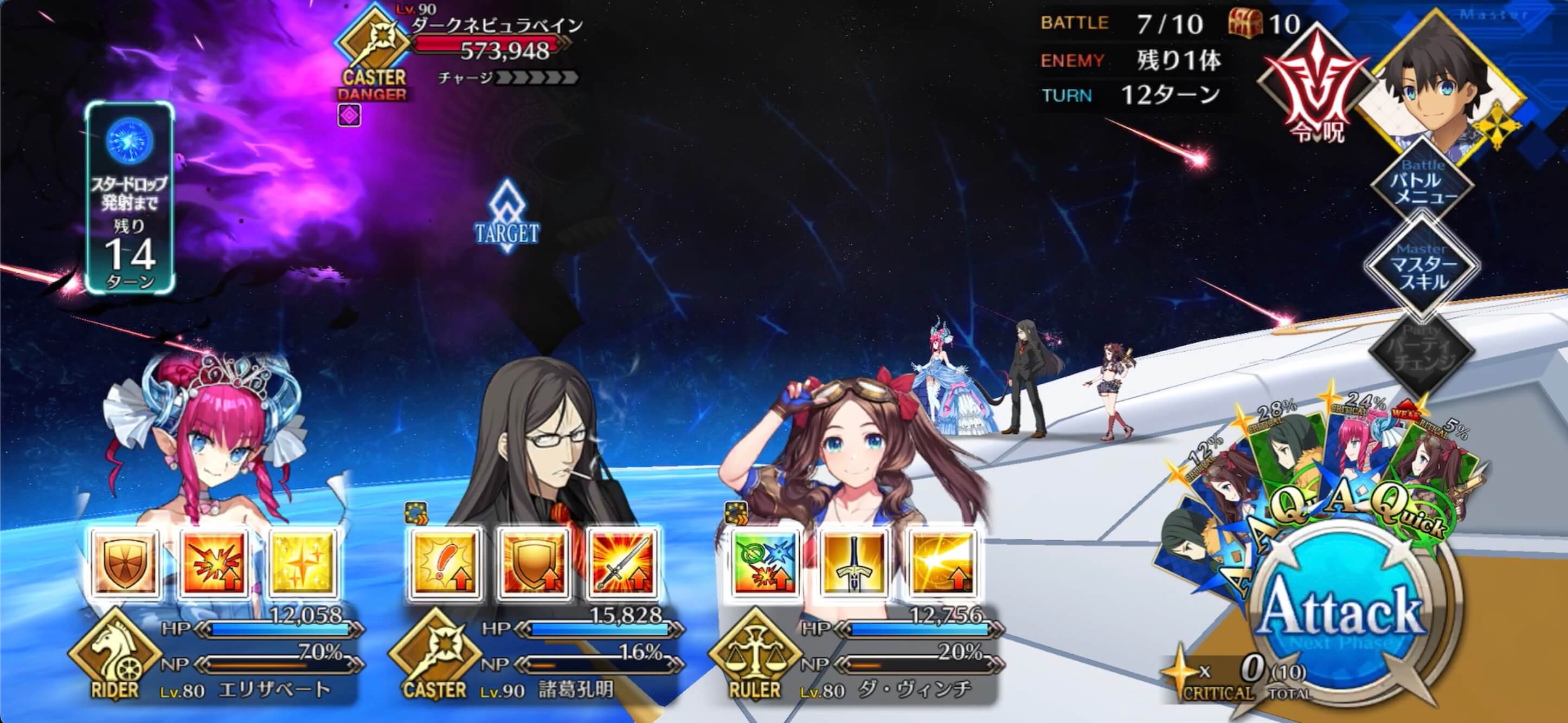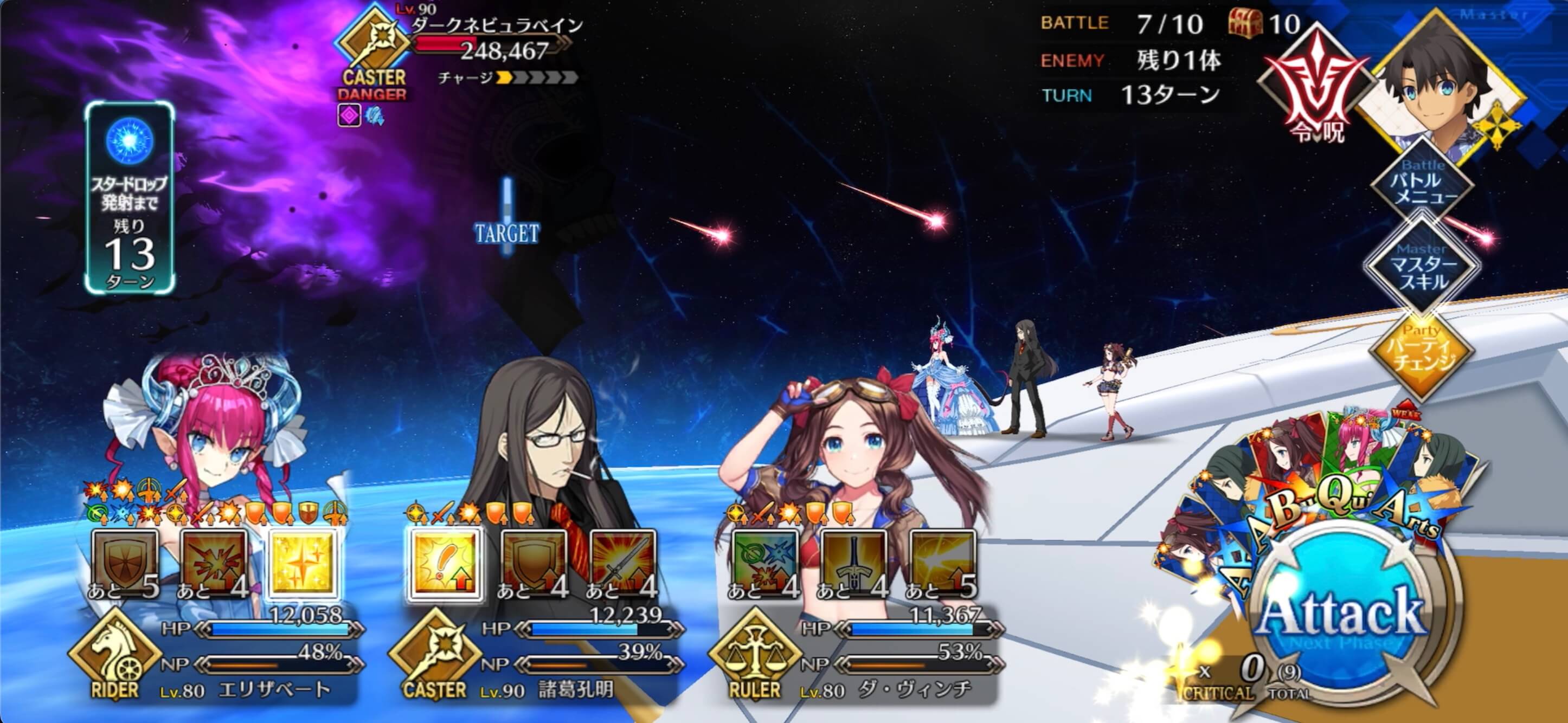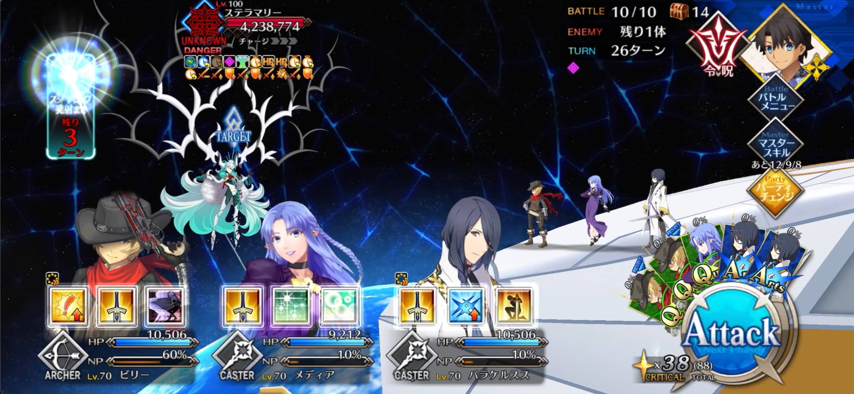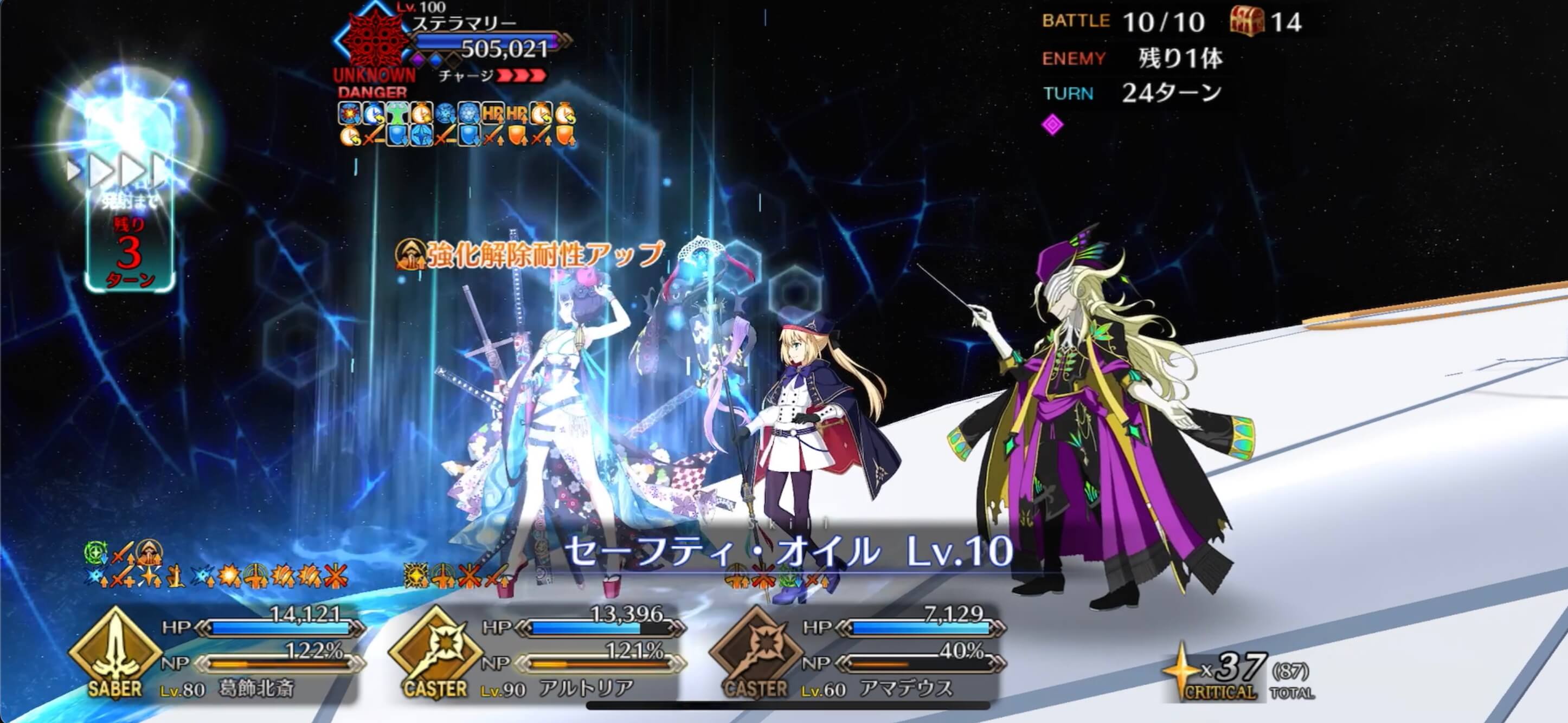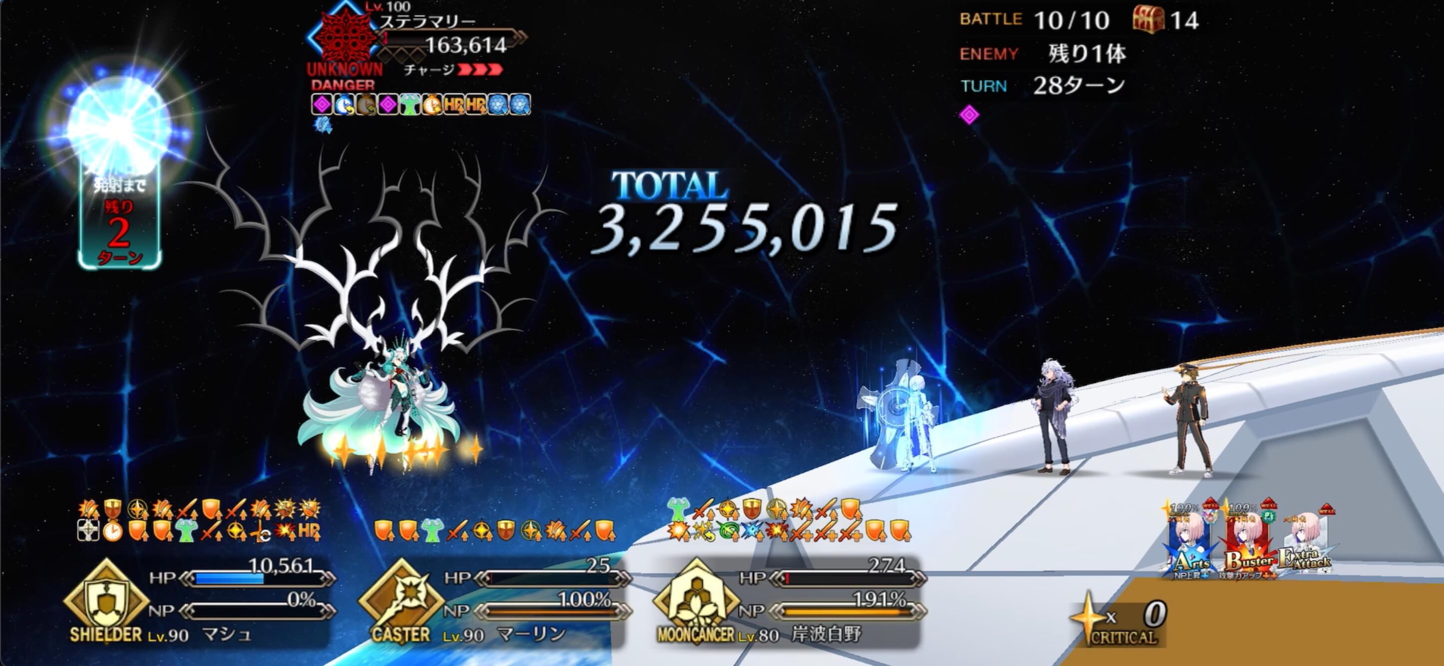 ステラマリーを最終ゲージにしたら、まずすべきは「スター99個」集め、「攻撃宝具で特殊耐性を下げる」です。直前のパーティが全滅しているため、スキルを使用するたびにスター10個が獲得できスター飽和は余裕です。