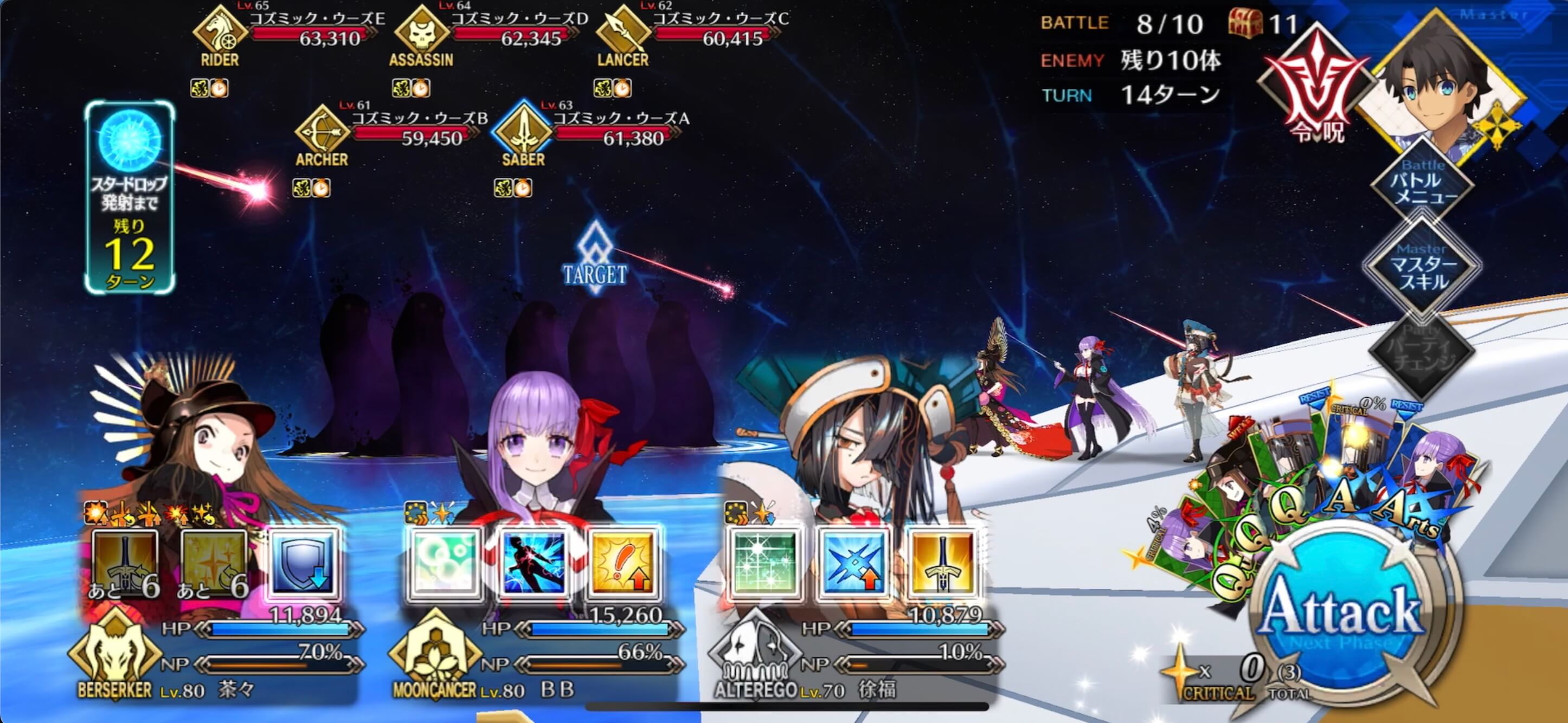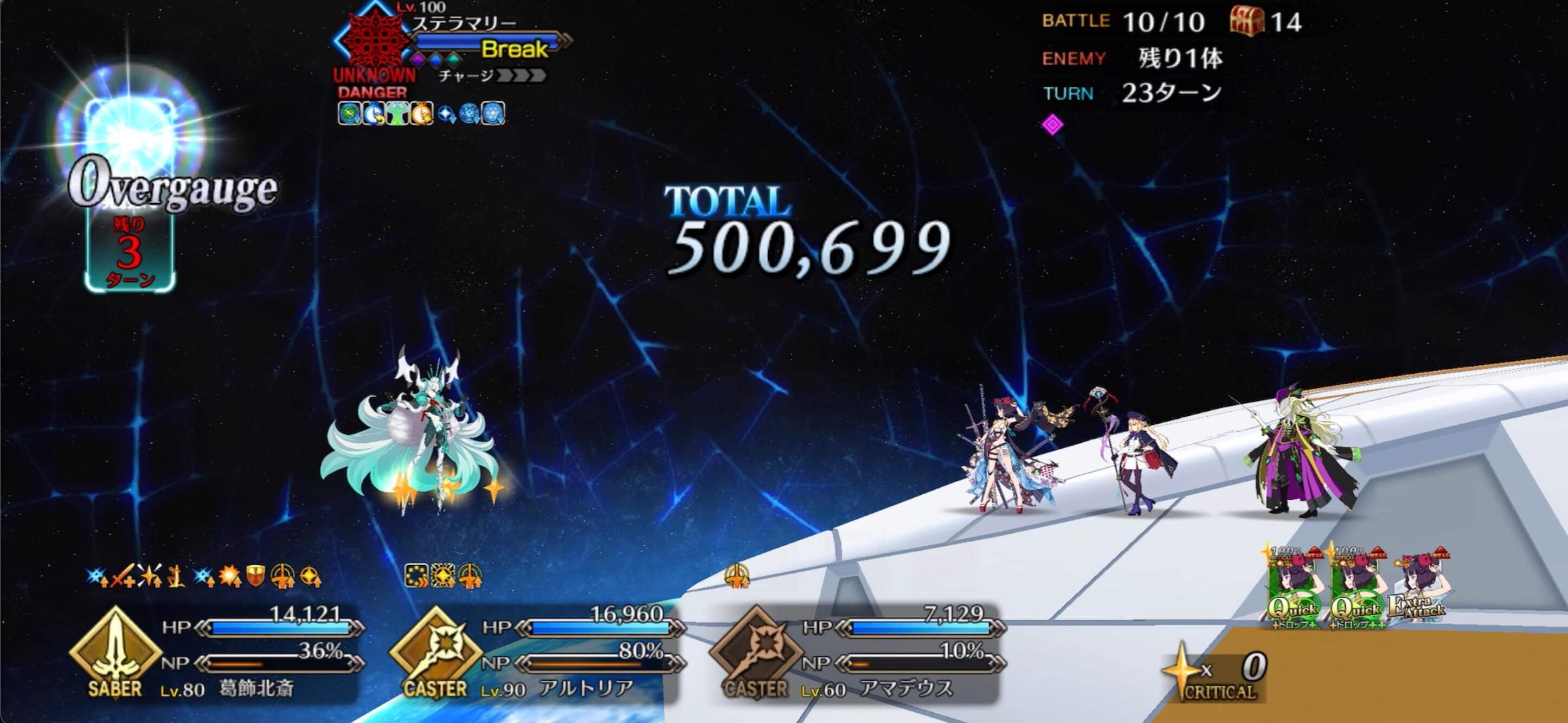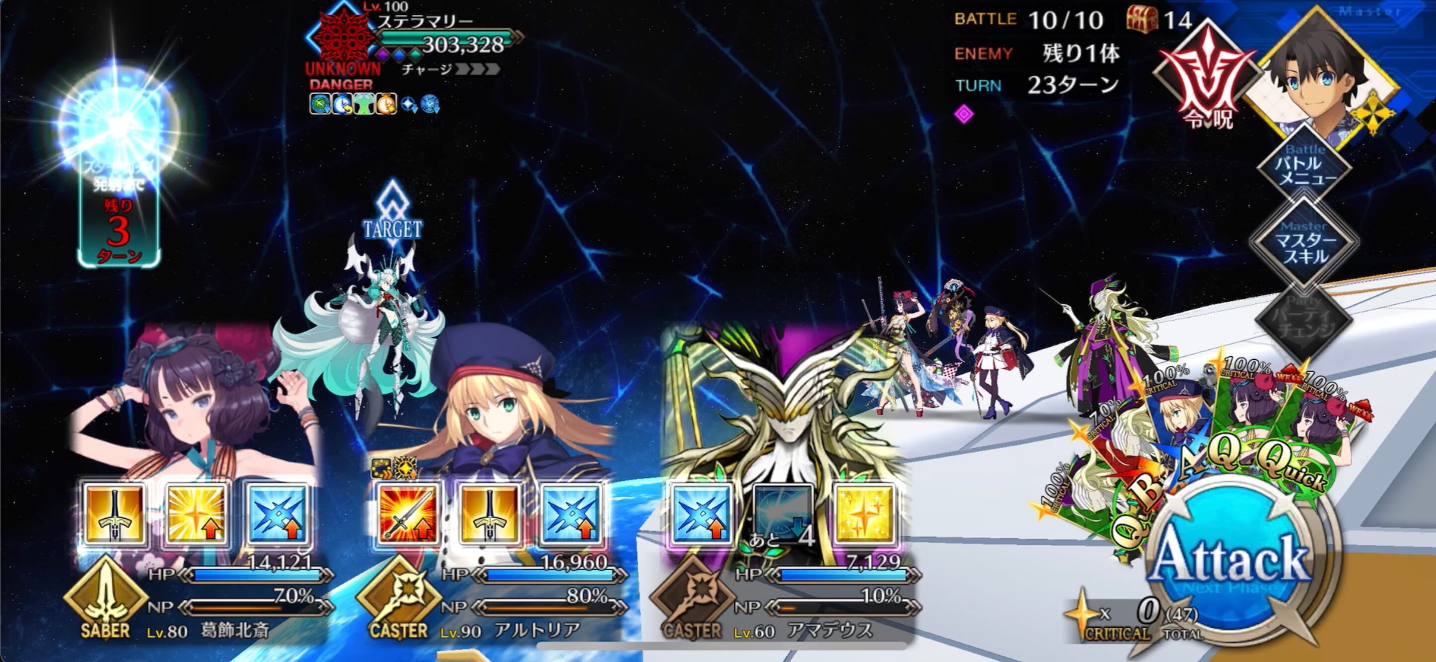 キャストリアとアマデウスのスキルを使用し、北斎のBAAでブレイク。1〜2ターンはカード運が絡むため、やはりアマデウス枠は岸波白野の方が多分安定します。