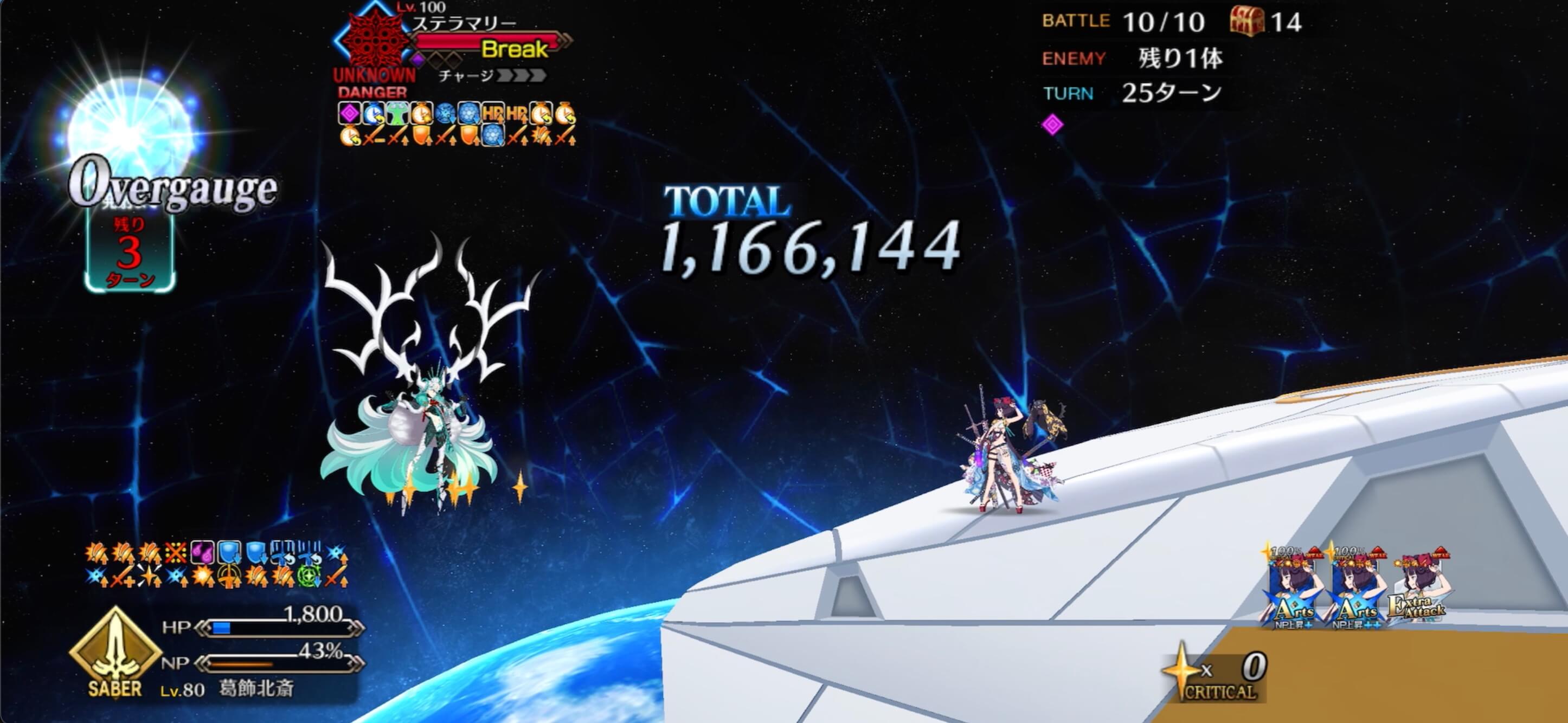 ステラマリーのスキルによるデメリット効果で、ダメージはかなり伸ばせるため、水着北斎の宝具で100万ダメージ出しています。最終ゲージまでブレイクできれば、水着北斎の役割は終了です。