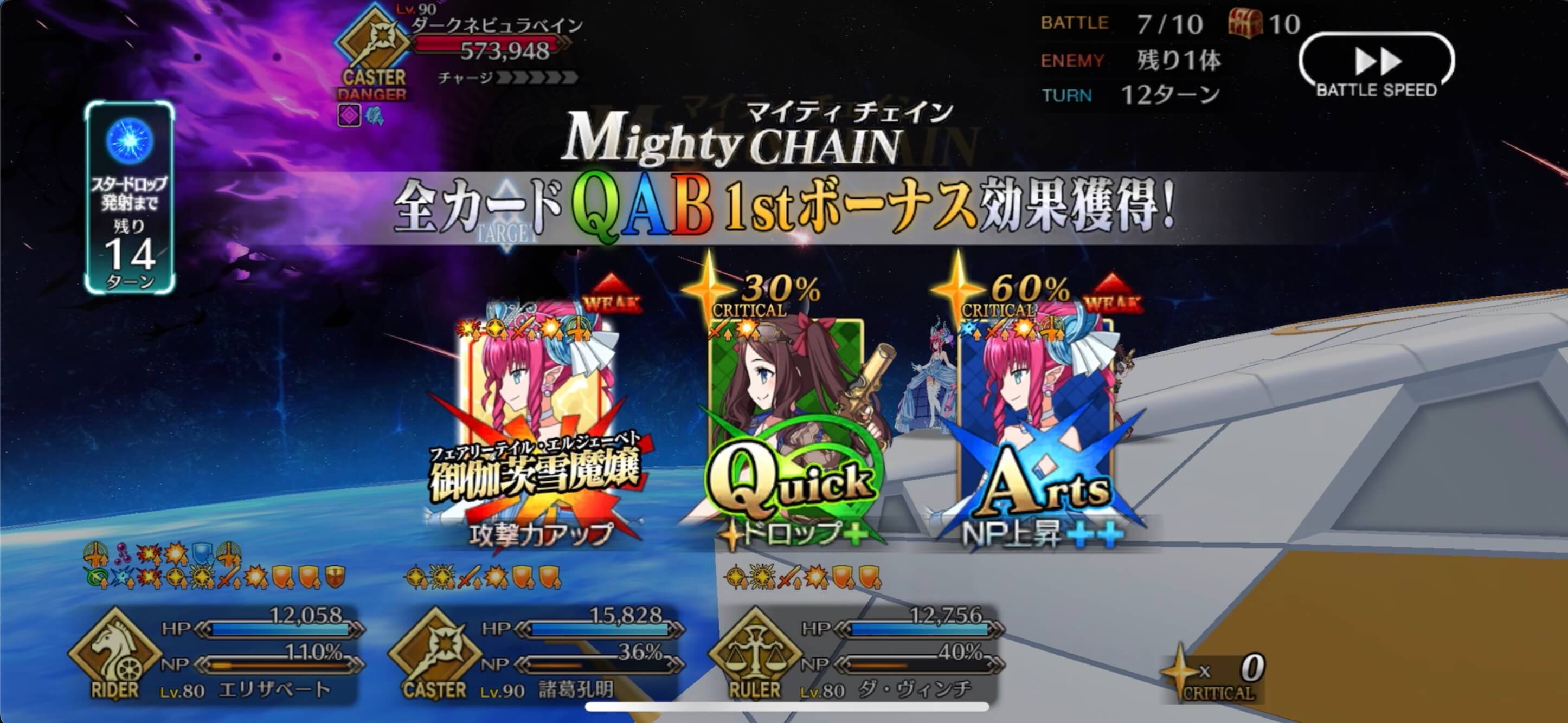 初ターンでマイティチェインを組んでNP回収できれば、シンデレラエリザのNPが約40%以上になります。残ったスキルを使用すれば、再度シンデレラエリザで宝具を使用でき、敵を撃破可能です。ただし、前のターンで孔明が被弾し即死しないのをお祈りする必要があります。