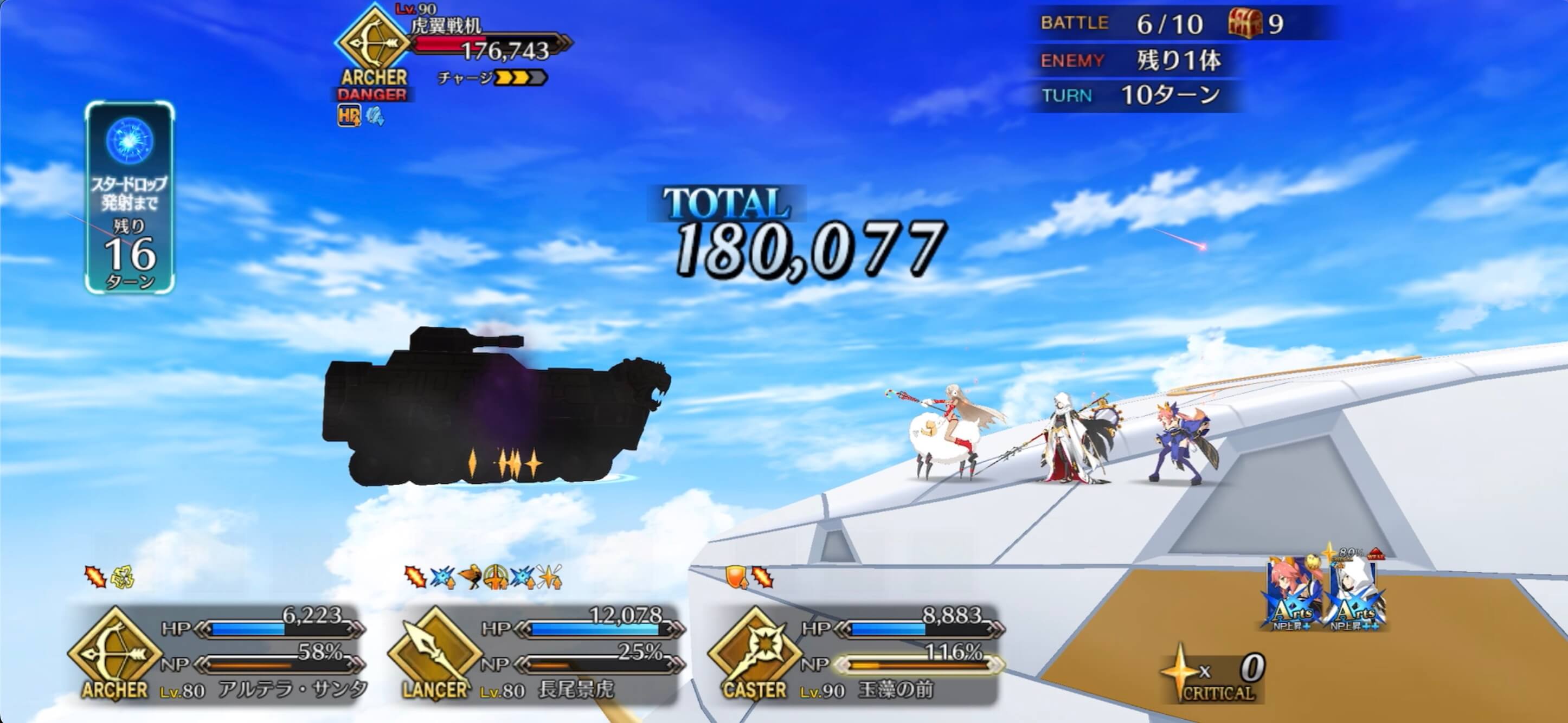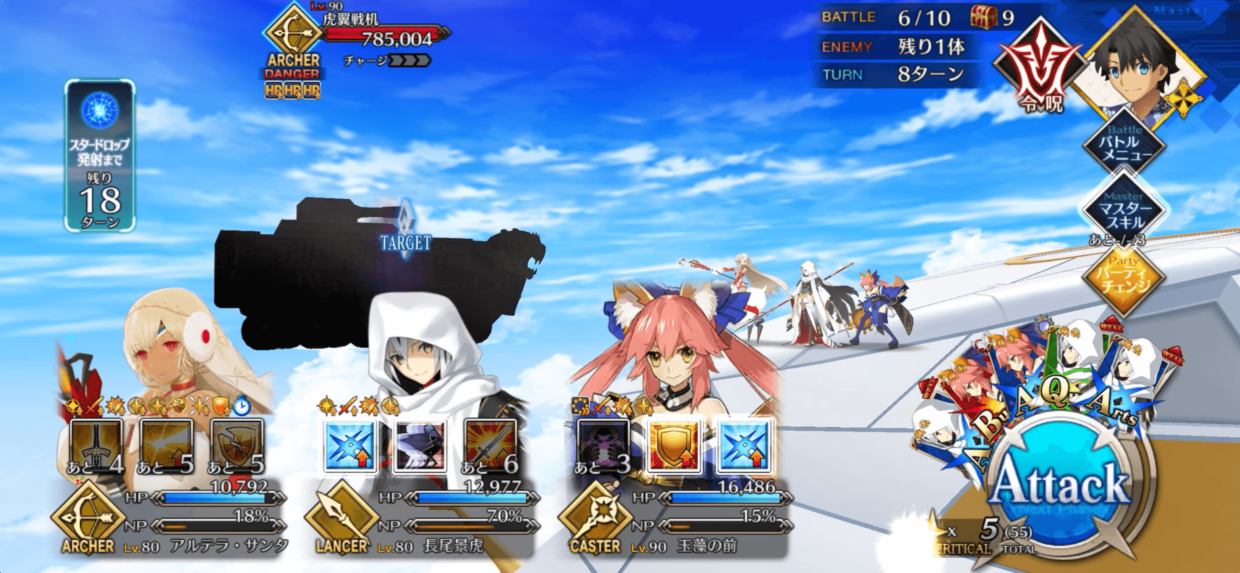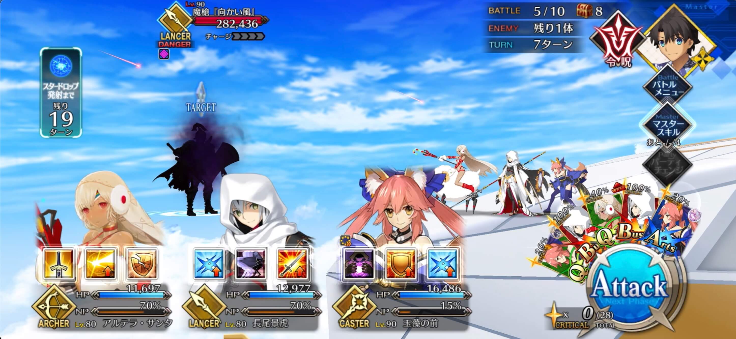 クラス相性有利となったアーチャーから、配布サーヴァントのアルテラサンタを起用しアタッカーを務めさせます。直前のバトルでクイック中心の攻撃をしたため、追撃でクリティカルが狙いやすい状態。玉藻の前でスキル1、長尾景虎でスキル3を使用し火力支援しましょう。