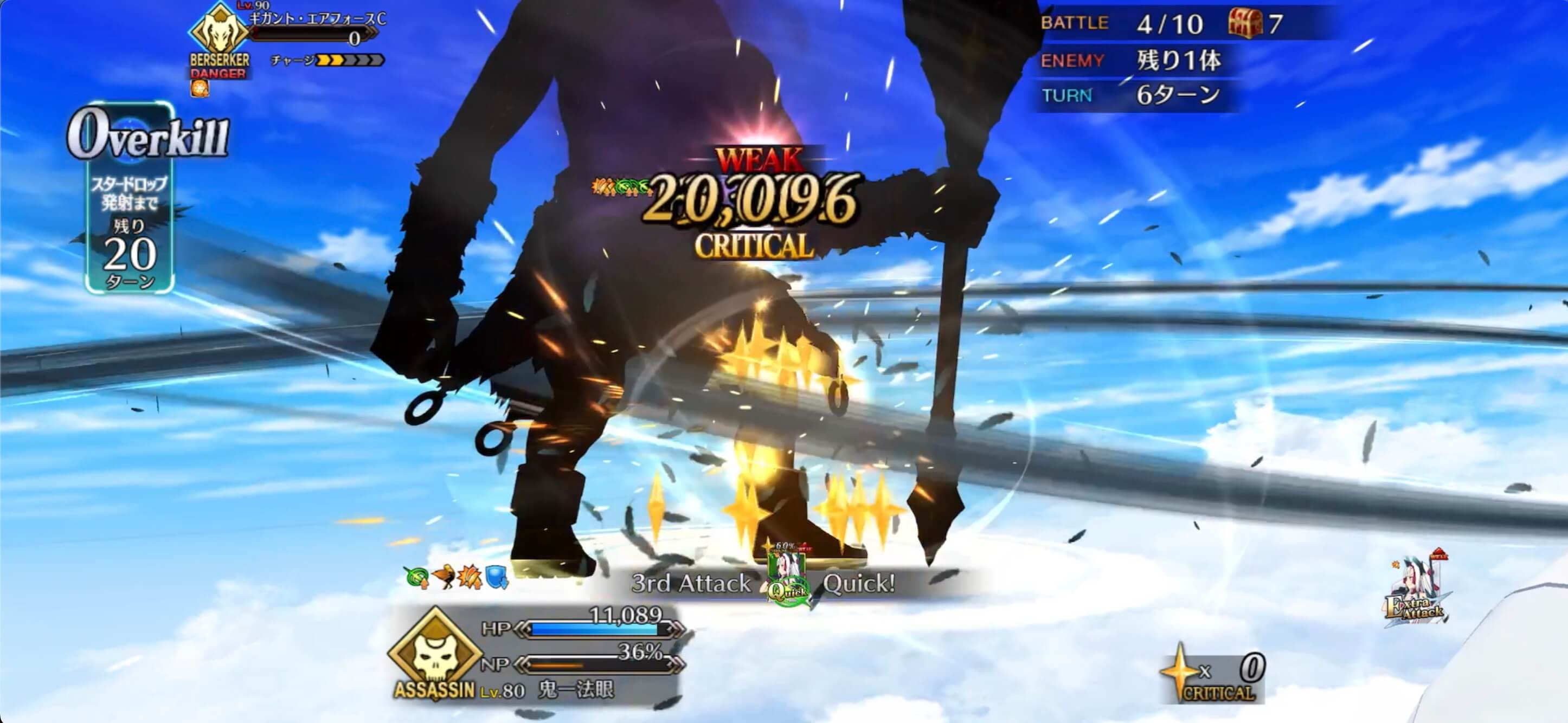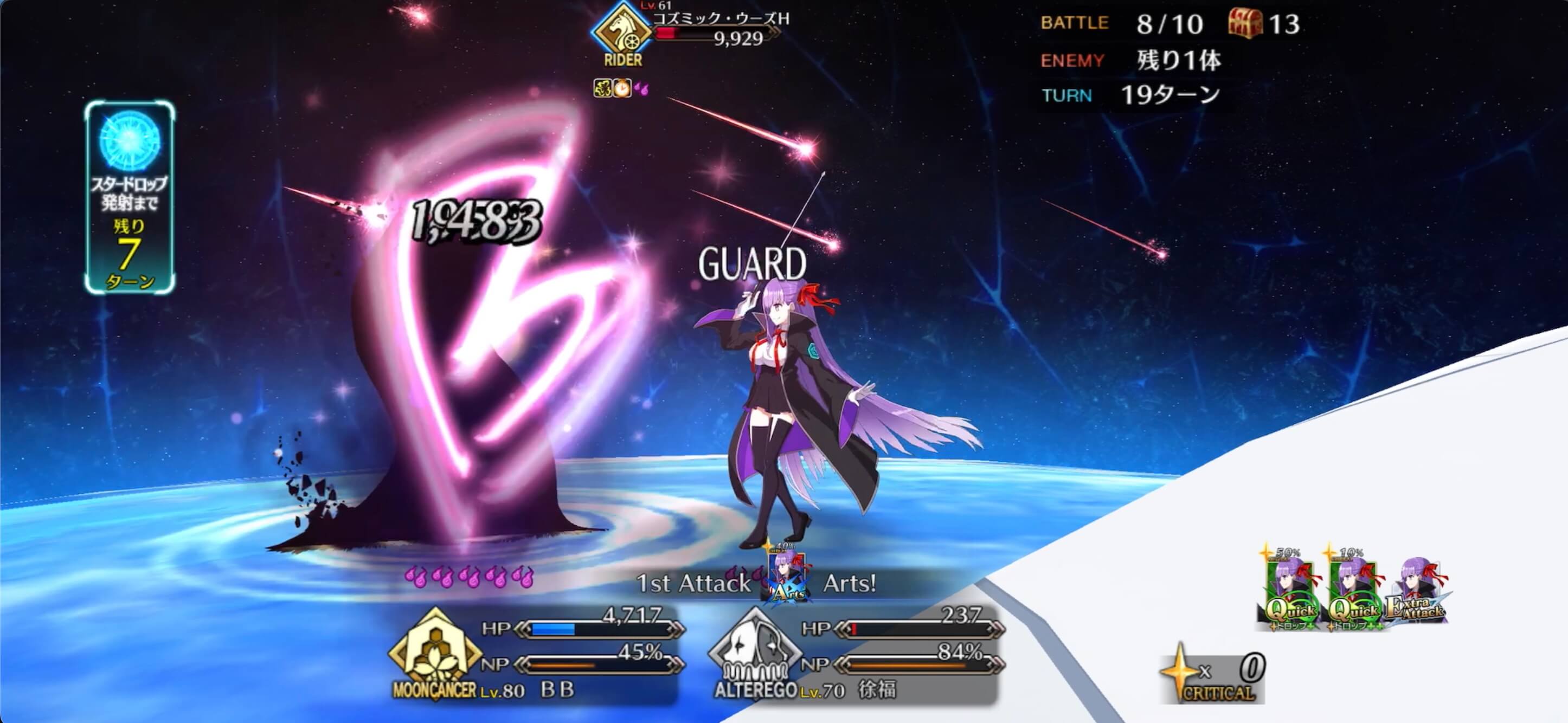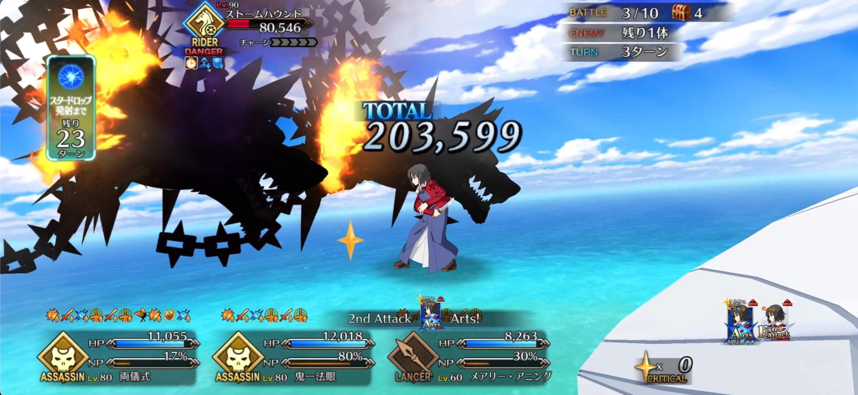 ただし、次waveでもクリティカルを出したいため、アニングのスキル2は温存推奨。代わりに、パーティチェンジ前に呪腕のハサンのスキル1を使用しておくのがおすすめ。両儀式のスキルと合わせてスター50個確保できます。