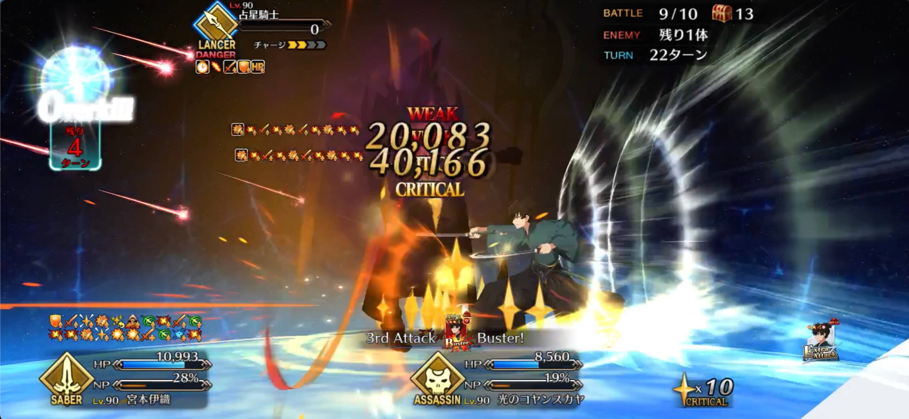 パーティチェンジを行い、アサシンの両儀式中心で攻めます。宝具だけでは飛ばしきれないため、殺式や鬼一法眼のカードで追撃をしましょう。事前にスキルも使用し、クリティカルスター獲得やクリバフも付与しておくと良いです。