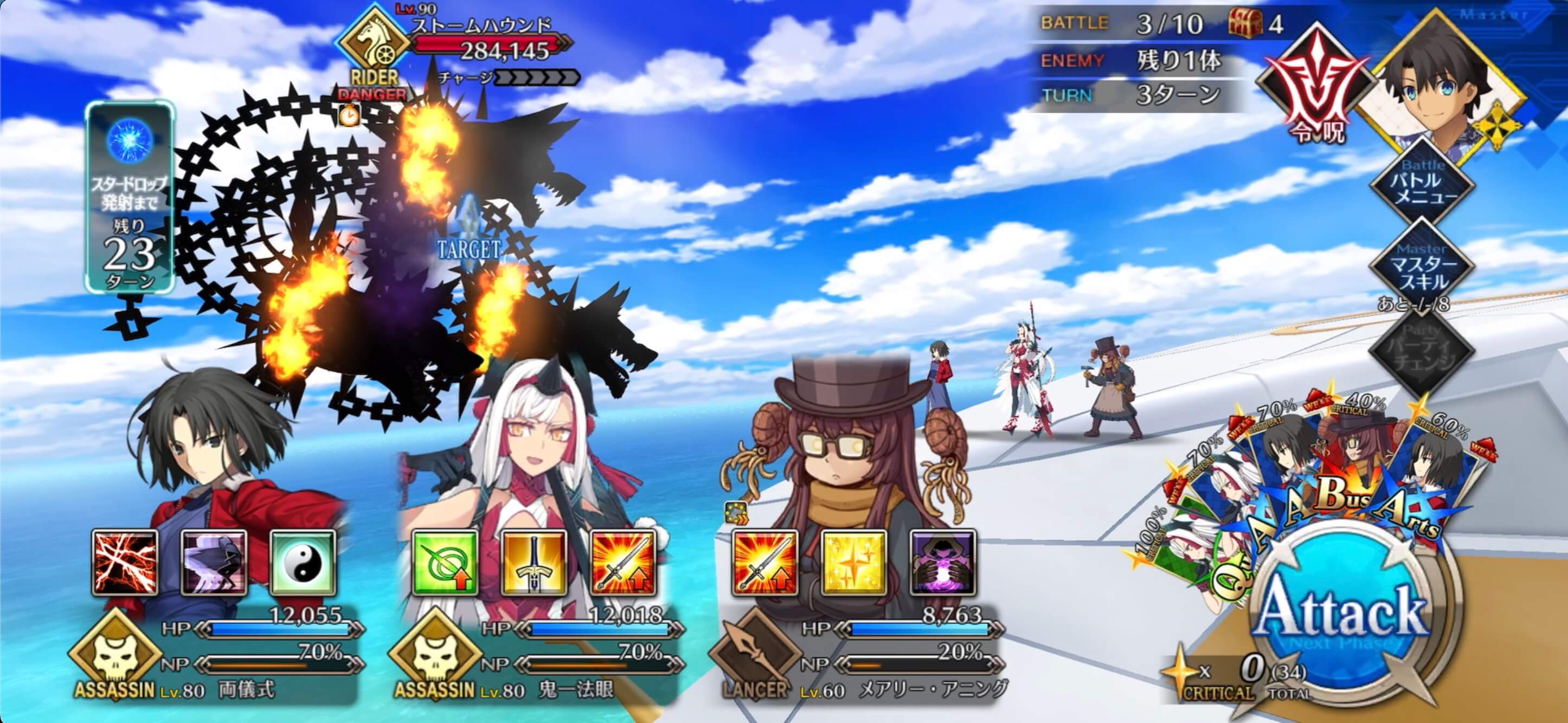 初ターンは、北斎の全スキル、キャストリアのスキル2&3、アマデウスのスキル2を使用して北斎のカード中心に選択。すでに、スターが50個あったため、アマデウスのスキル3は温存してます。