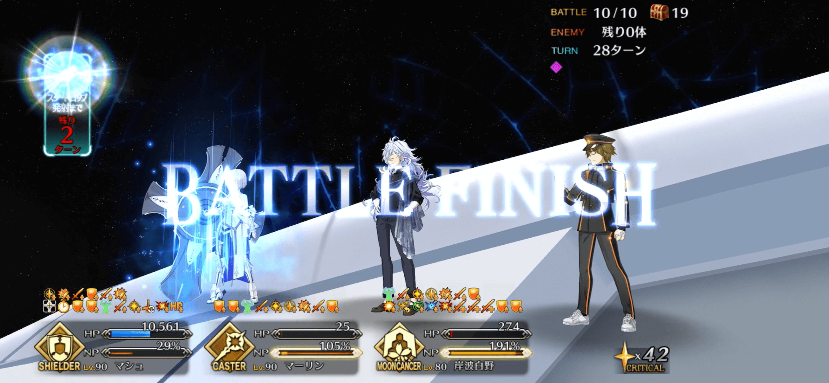 マシュが出てからはスムーズに進み、全28ターンでオルガマリークエスト4クリアできました。10パーティ目は一切登場せず終わったため、道中の時短用にパーティを組み直した方が制限時間に余裕ができそうです。