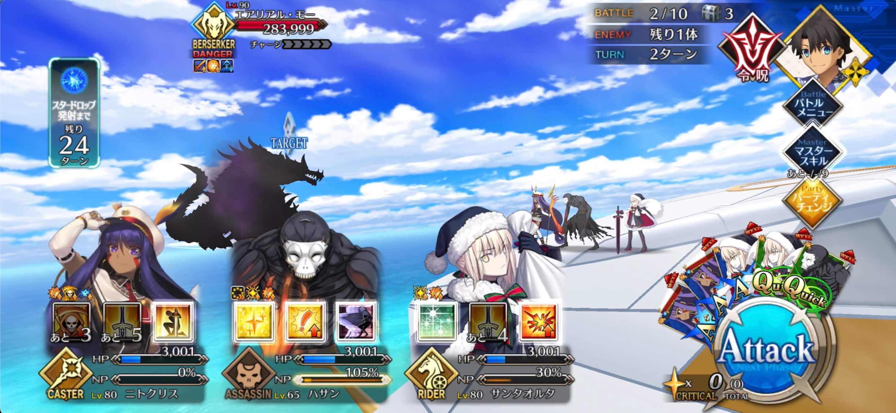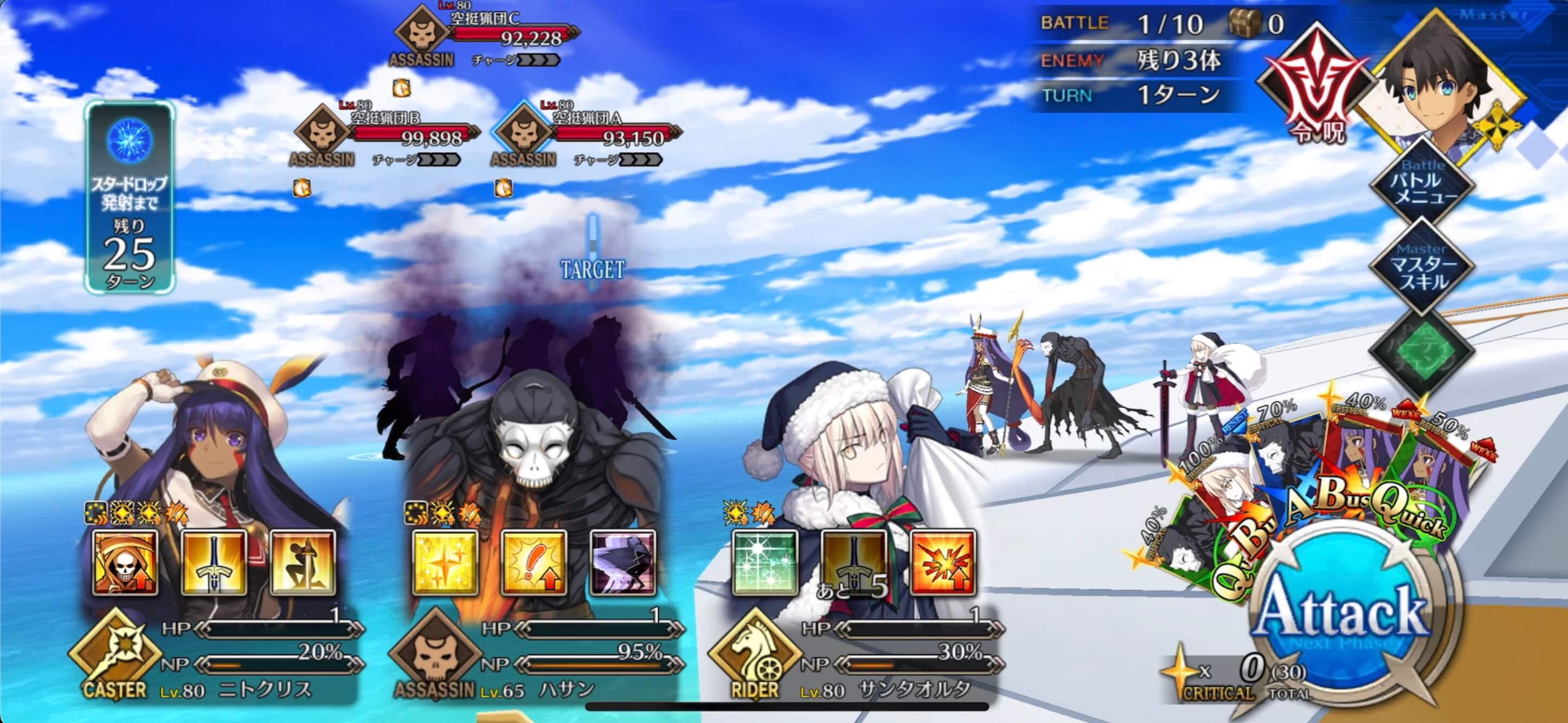 即死持ちの全体宝具と単体宝具をそれぞれ用意。即死は100%以上が安定。呪腕のハサンが100%に満たないため、安定化のためにOC強化のサンタオルタを編成。即死付与率の高いキャラに変更できれば、サンタオルタの枠はNP供給だけのキャラに持ちに切り替え可能です。