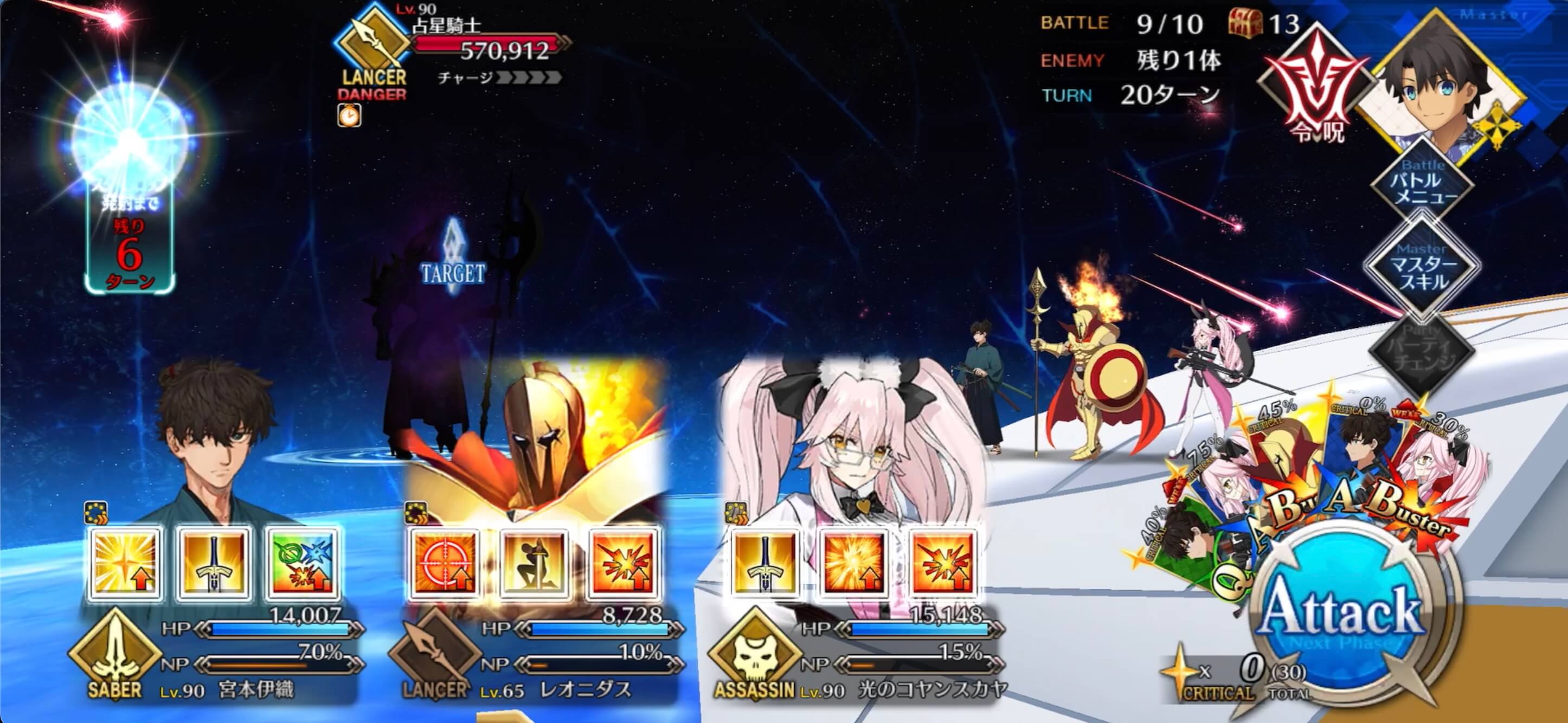 1ターン目は必要なスキルを全て使用して、スター稼ぎ目的で適当なカードを選択。2ターン目から宝具やクリティカルで攻めていくのがおすすめ。1ターン目の敵の火力が非常に高くなっているため、レオニダスに盾役を担当させておきましょう。