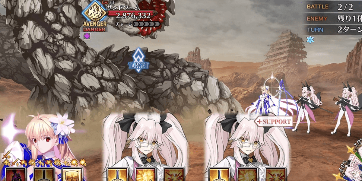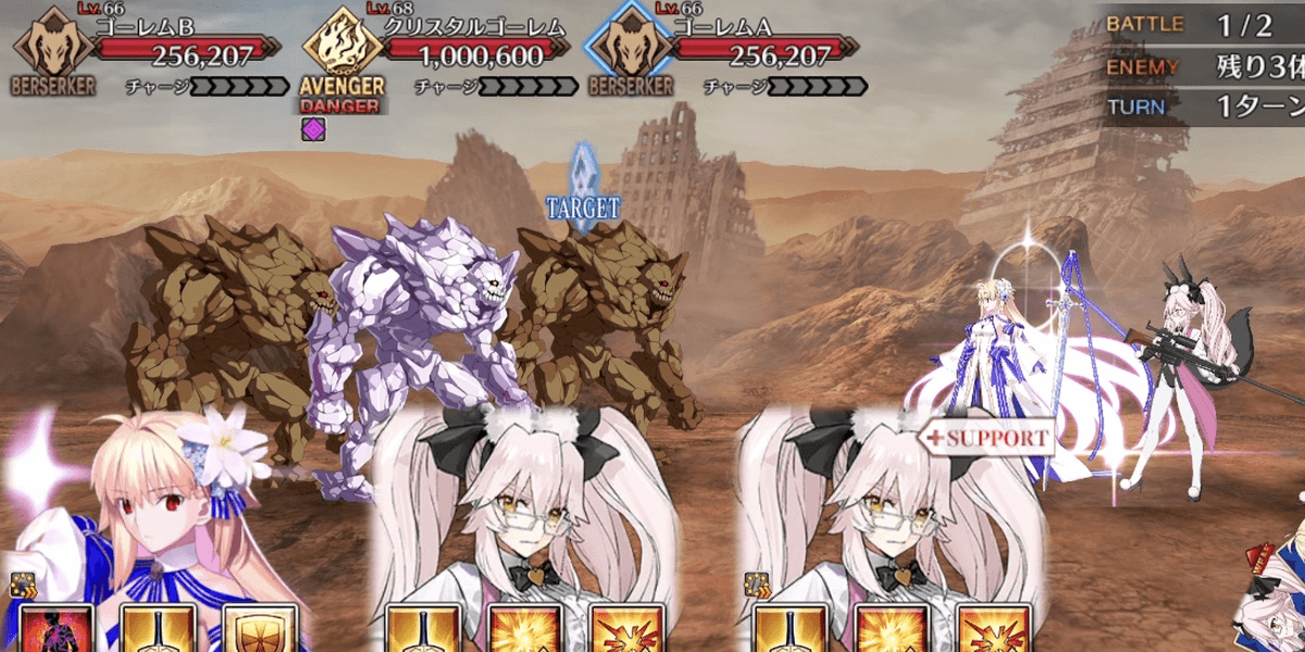 2waveの敵にBBの宝具を2回使用するが、どちらも最低乱数を引くと30万ほど残る。平均値でも6.5万程度残るため、2〜3ターン目は追撃にBBのカードを選択しよう。3ターン目に令呪を使用するため、クラススコアによる令呪バフを有効化しておくのも良い。