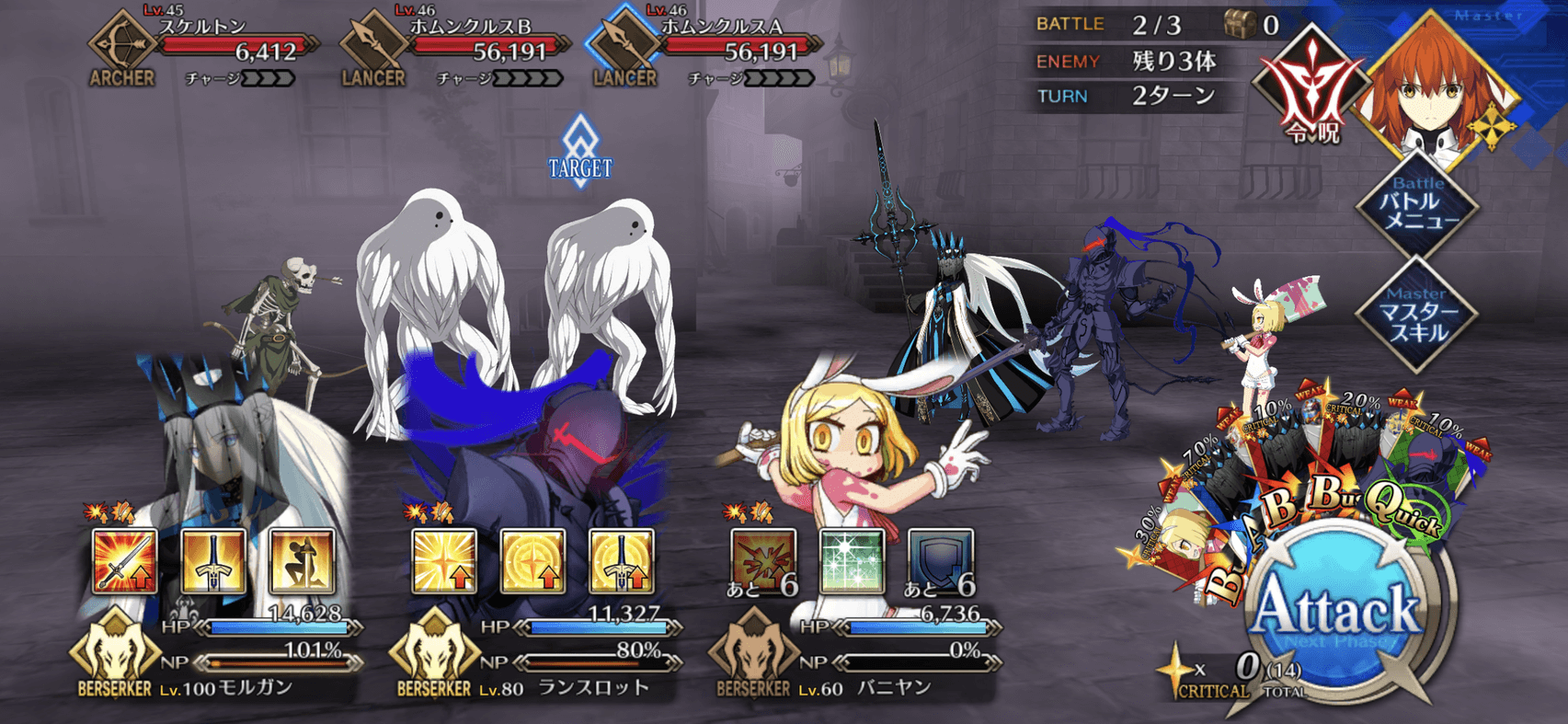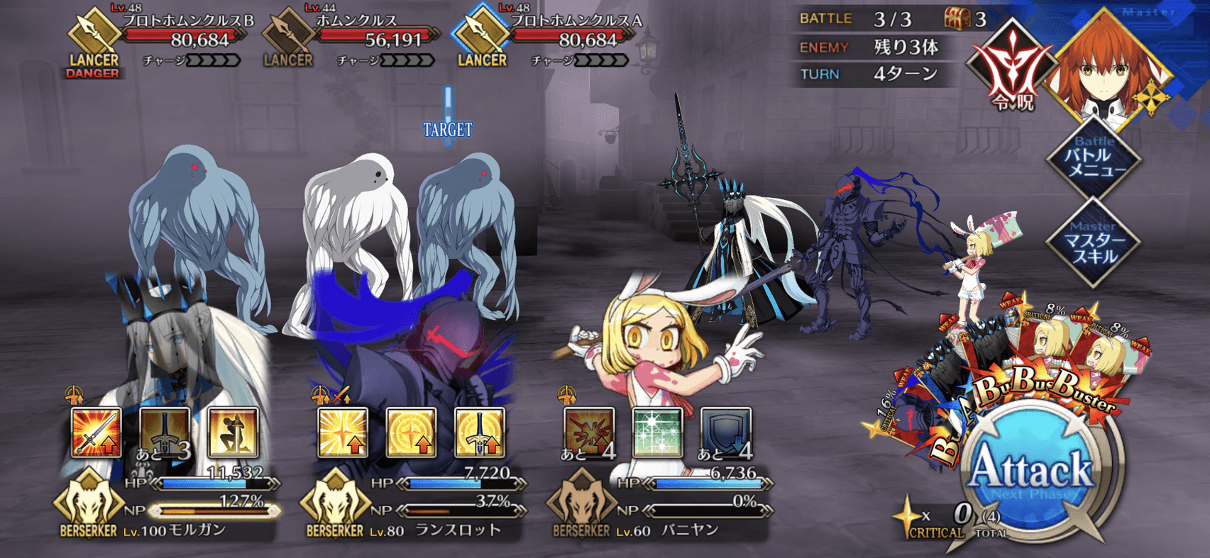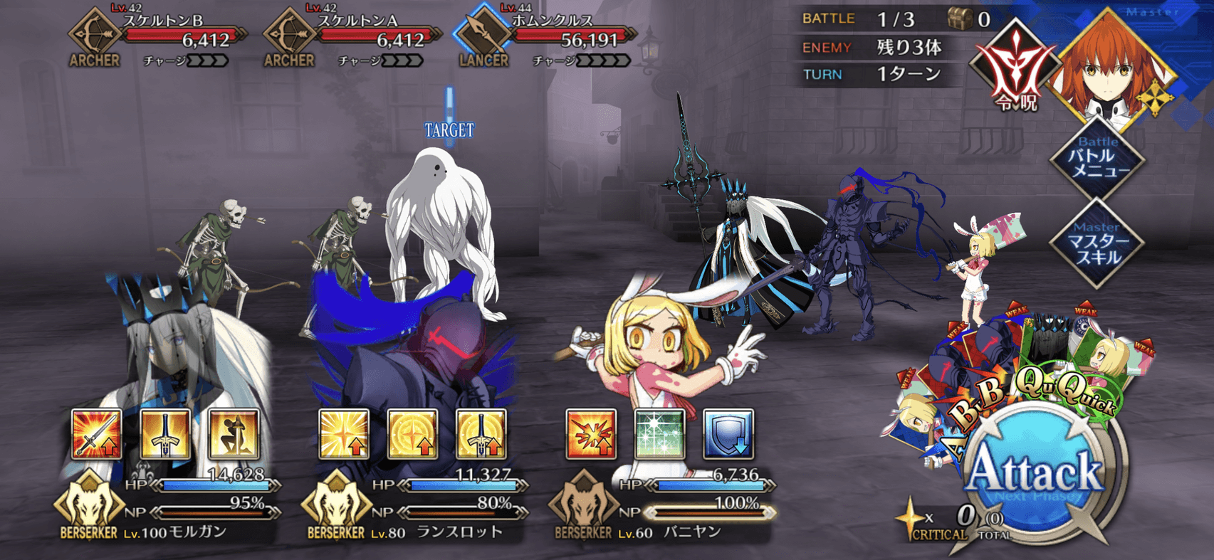 アーチャーとランサーの敵が混成で出現するため、全員に攻撃相性有利なバーサーカーをフレンドから借りるのがおすすめ。HP5万以上のエネミーが多く出現するため、手持ちでも育成済みのバーサーカーを組み込むと良い。