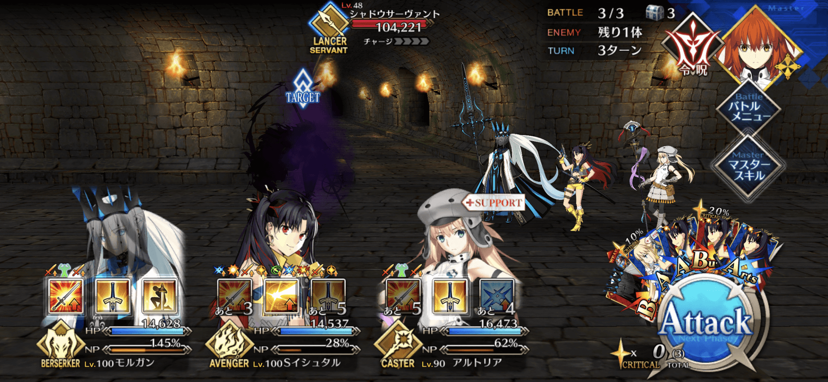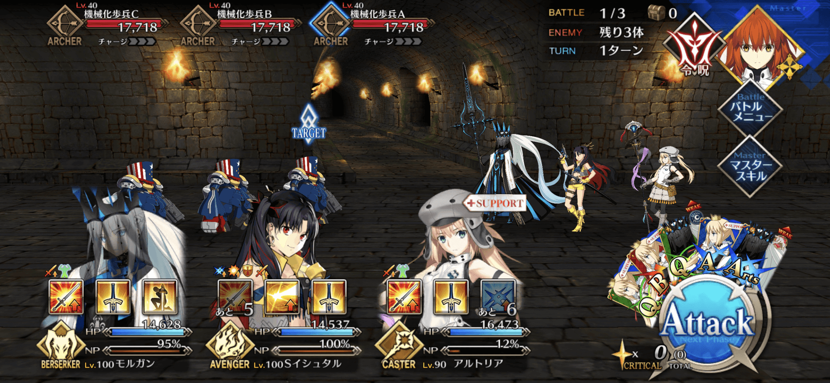 敵はアーチャーとランサーなので、それぞれに攻撃相性有利なランサーとセイバーを編成しよう。1〜2戦目に複数のアーチャー、3戦目にランサーが1騎出現するので、全体宝具のランサーと単体宝具のセイバーを編成するのがおすすめだ。