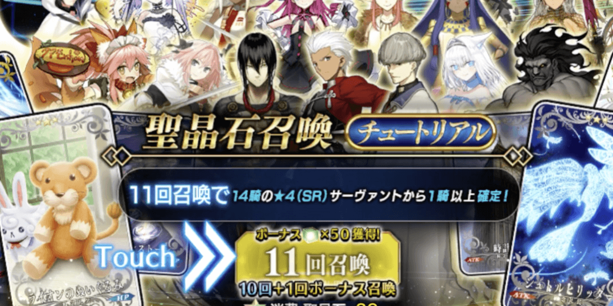 データのダウンロードが終わったら、チュートリアルを進めて「聖晶石召喚〔チュートリアル〕」を引こう。チュートリアルガチャでは準高レアの星4キャラ(サーヴァント)1騎が確実に排出されるため、一番最初のリセマラ終了タイミングとなる。