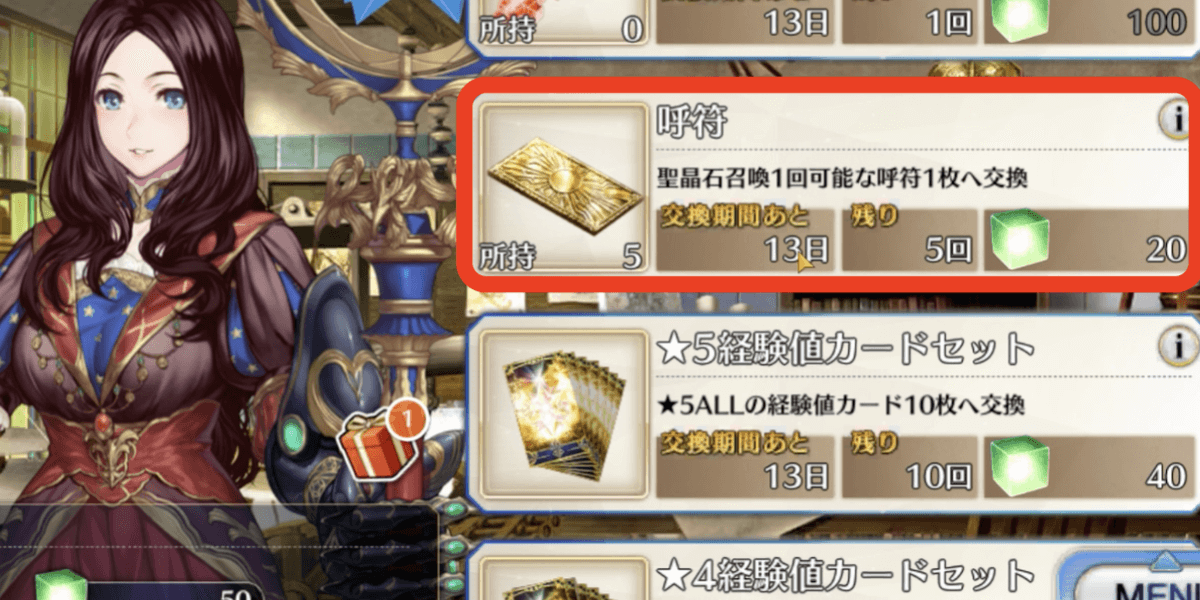 ガチャの回数を増やすため、「マナプリズム交換」で呼符を交換しよう。ログインボーナスで受け取ったアイテムの中から「猛火の種火」をショップの「霊基変換(売却)」で売却し「マナプリズム」を入手しよう。