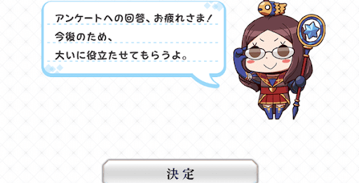 | 内容 | ・プレイ環境アンケート ・ガチャやキャラ実装に関する意見など |