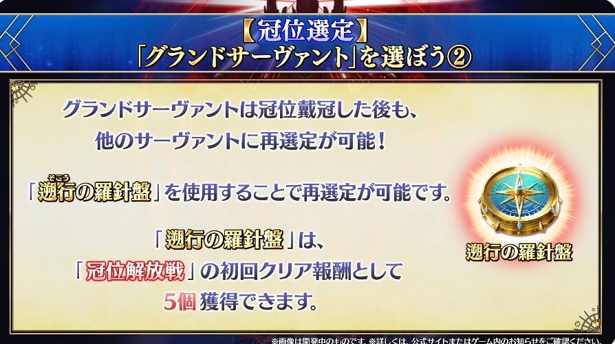 一度選択したグランドサーヴァントは「遡行の羅針盤」を使うと選び直せる。「遡行の羅針盤」は冠位解放戦クリアで5個入手でき、再選択時に1個消費する。