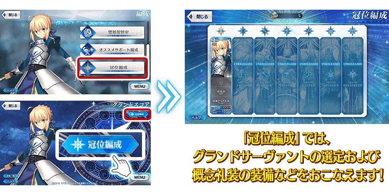 冠位解放戦をクリアした後、「編成」に出現する「冠位編成」からグランドサーヴァントを選定できる。グランド化の条件を満たしているサーヴァントのみを選出可能であり、条件を満たしていない場合は選択できない。