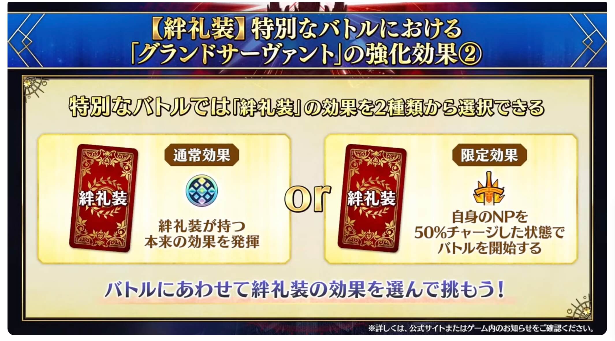 グランドサーヴァントで設定する絆礼装の効果は、NP50%チャージ効果に変更できる。絆礼装効果がマッチしてないと感じたら、NP50%チャージ効果に変えるのも手だ。