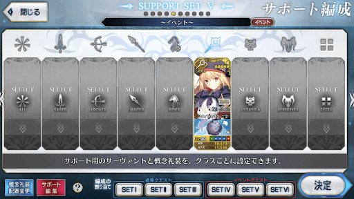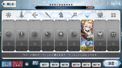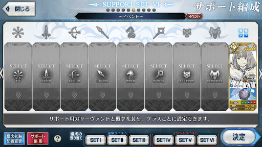 サポート編成は各クラスごとに1騎ずつ設定できる。1番左「ALL」は全てのクラスのサーヴァントを設定でき、1番右「EXTRA」はシールダーなどの特殊なクラスを設定する箇所である。