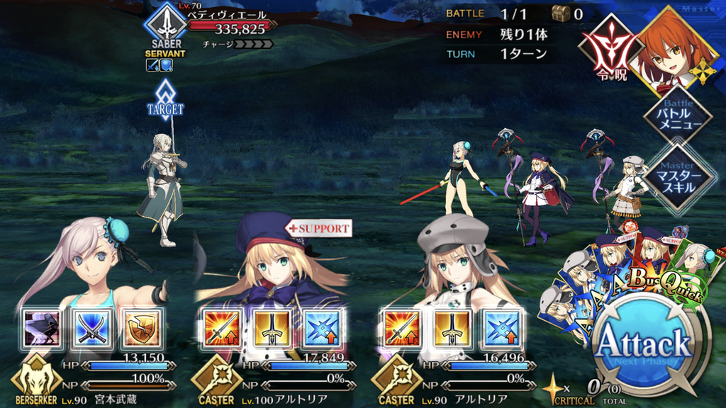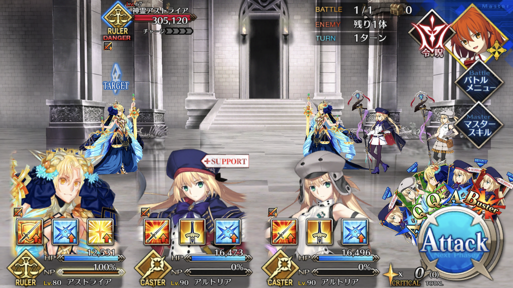 敵はルーラーなため、クラス相性有利のアヴェンジャーと、強制スタメンのアストライアを「オーダーチェンジ」で交代すると良い。アヴェンジャーが手持ちにいない場合は、アーツ性能アップやスターを供給できるサポーターでアストライアを援護しよう。