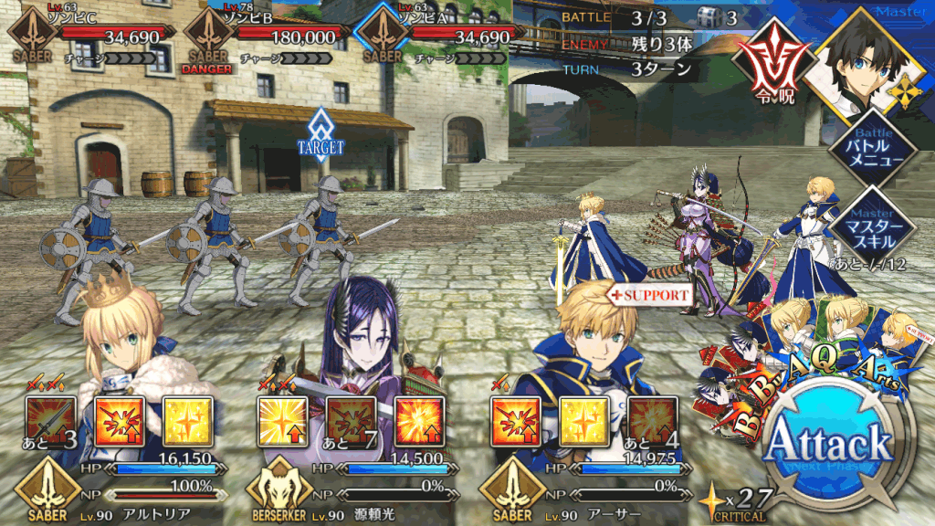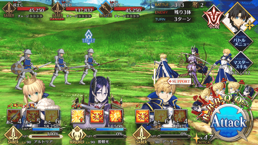 前回と同じく、敵はセイバーとランサーのみの編成。序盤は全体宝具セイバーで一掃し、最後の高HPセイバーは単体宝具アーチャーで倒そう。