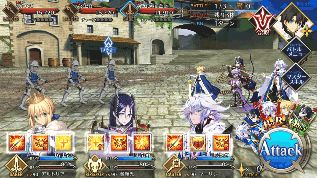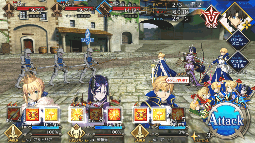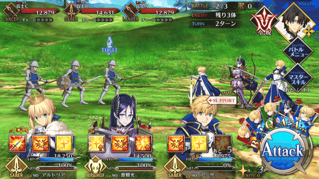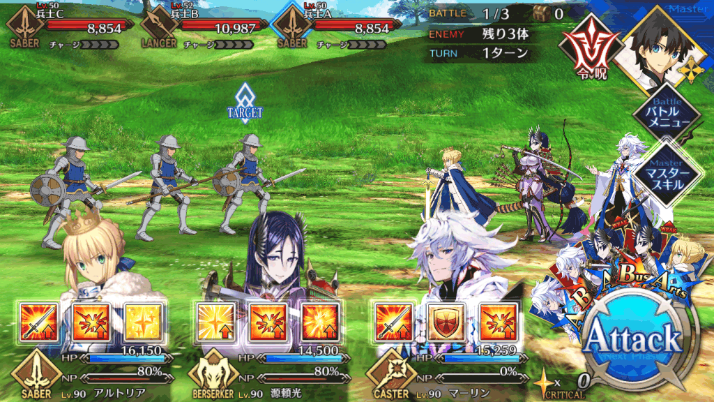 敵はセイバーとランサーの編成なため、序盤は全体宝具セイバーで一掃するのがおすすめ。最後のセイバーは1体だけHPが高いため、単体宝具アーチャーで倒そう。