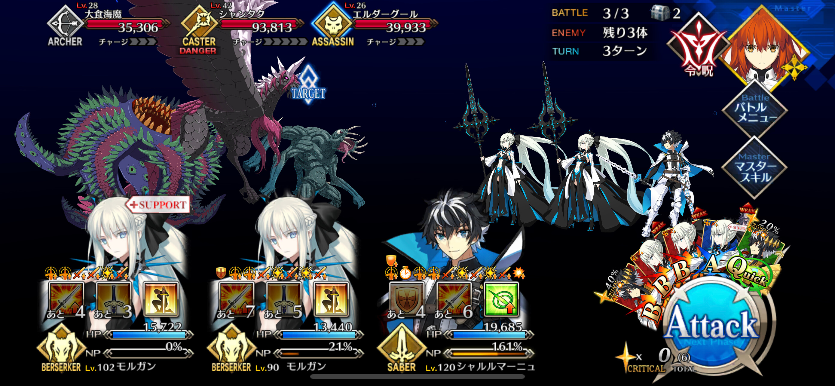 敵はアーチャーとキャスター、アサシンの混成編成なので、全体攻撃宝具持ちバーサーカーで一掃しよう。もしくは相性有利になりやすいランサーやキャスターで倒すのもあり。