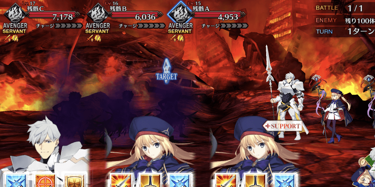 | ・ボスを倒せばクリア ・合計99体のアンリマユが出現 【ブレイクギミック】 ●1回目: ・敵全体に呪い付与(1,500ダメージ) ●2回目: ・味方全員に無敵付与(3T) ・自身にスタン付与(2T) |