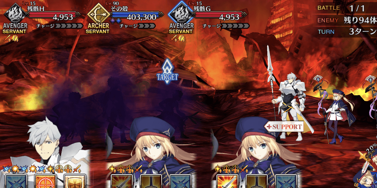 ・四夜の終末[EX]が再強化 ・アーツ性能アップ追加(5T/ターン経過で効果アップ) ・ガッツ付与が選択式に変更 (付与しない or HP1 or HP50%)(6T/1回/重複可) ・NPチャージ追加(20%~30%) |