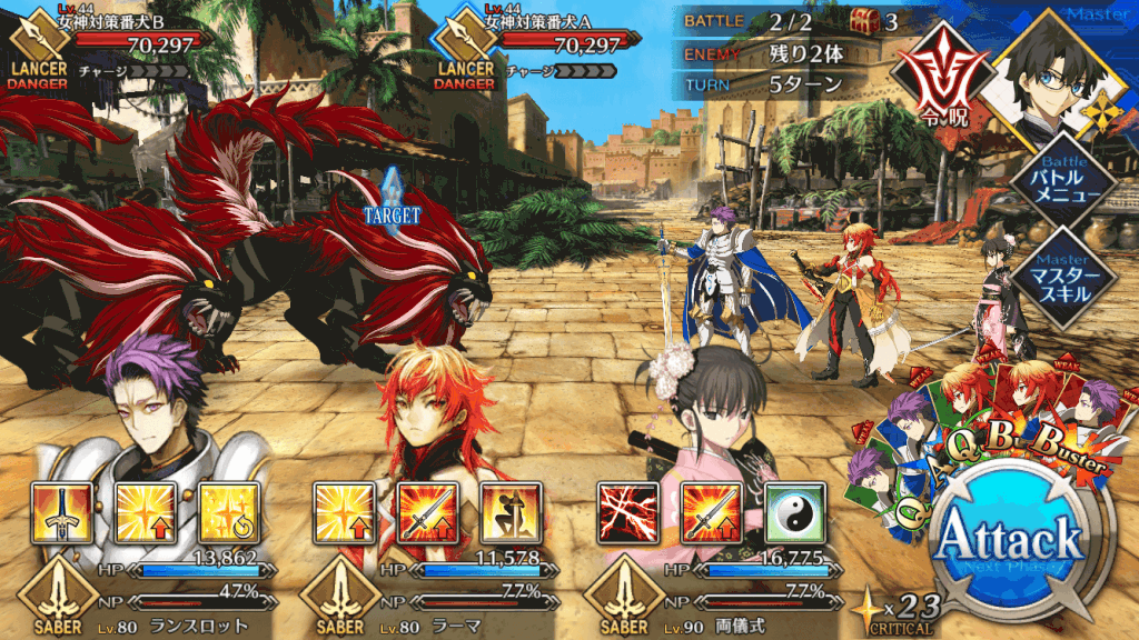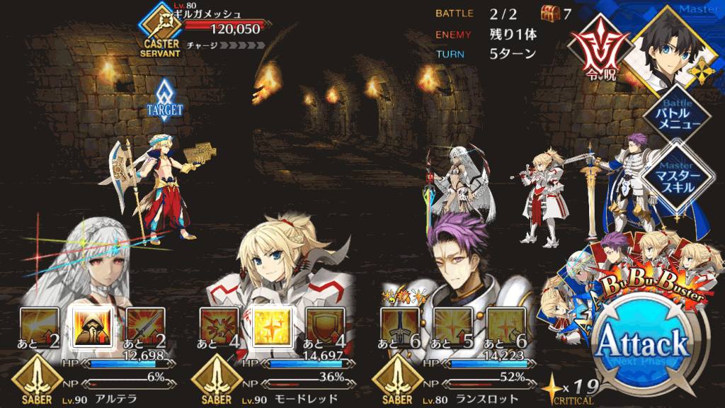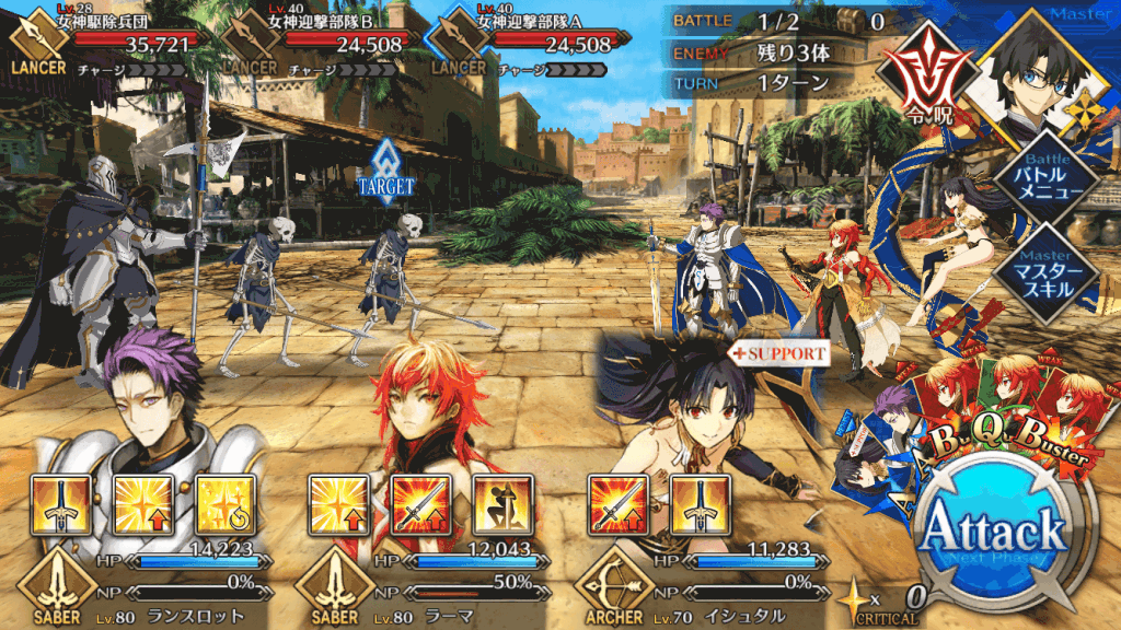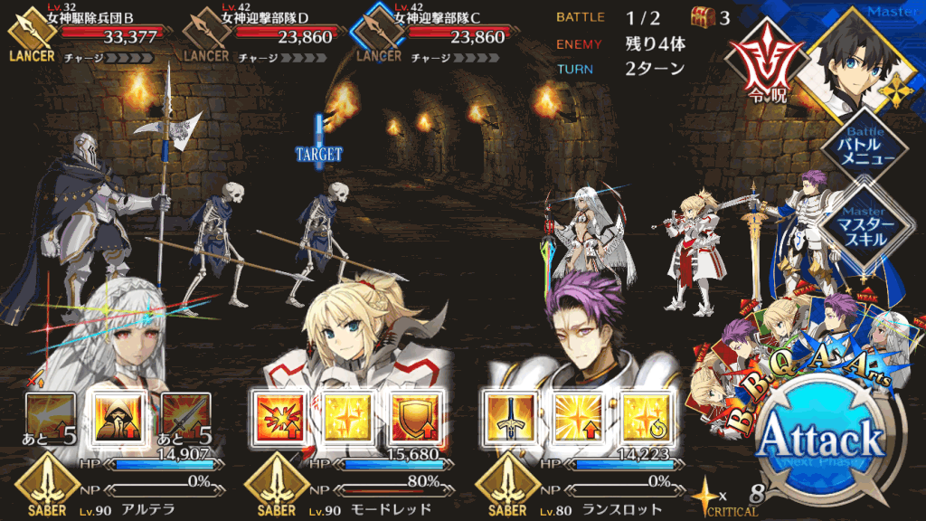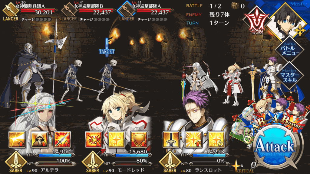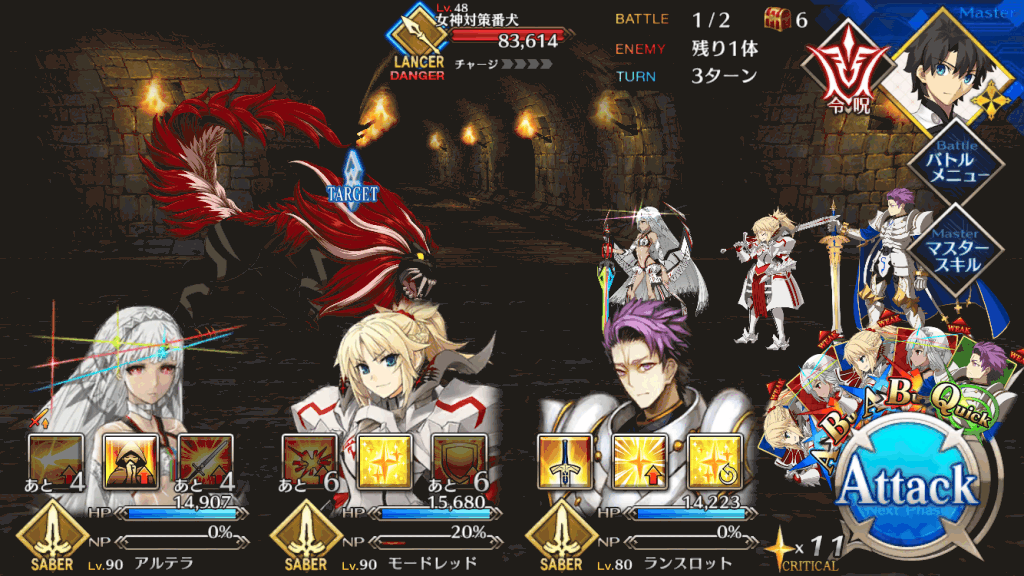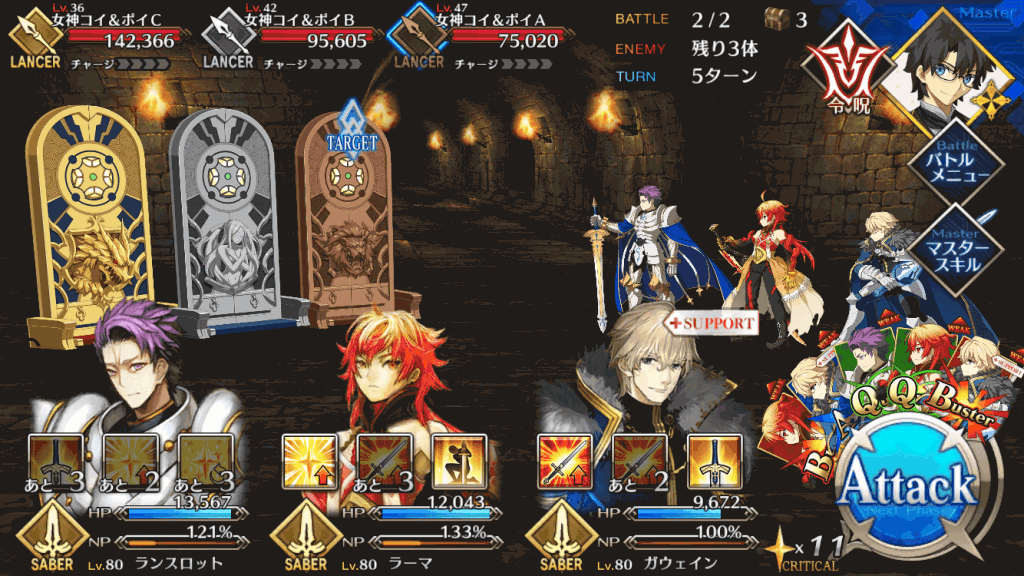 敵はランサーとキャスターの編成なため、序盤は全体宝具セイバーで一掃するのがおすすめ。最後のキャスターは単体宝具のライダーやアルターエゴで倒そう。