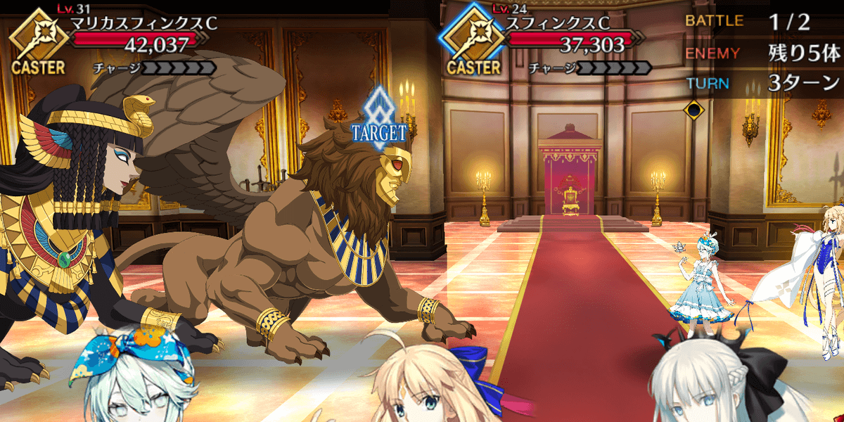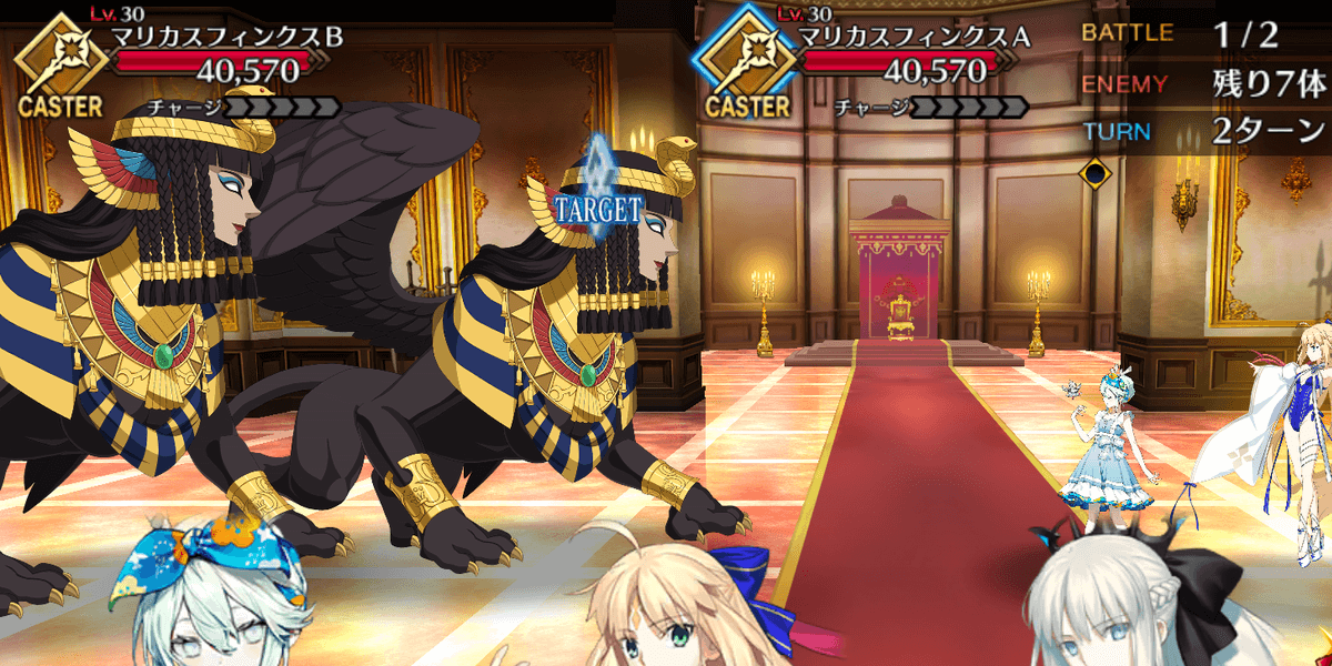 カフラースフィンクスの登場まで、相性有利の全体攻撃宝具持ちライダーで一掃しよう。火力とNP周りさえ問題なければ、任意のシステムアタッカーでひたすら倒すのもあり。