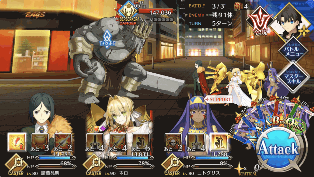 敵はアサシンとバーサーカーのみのため、キャスターを中心にパーティを編成しよう。最後のリア王のHPが高いため、全体宝具だけでなく単体宝具のアタッカーも編成すると楽に攻略できる。