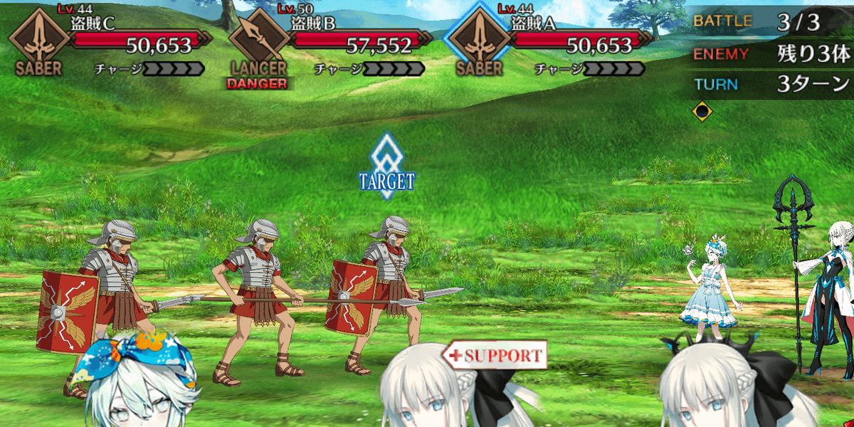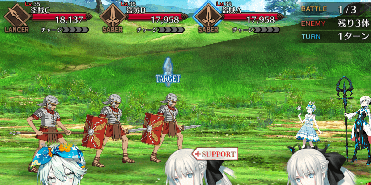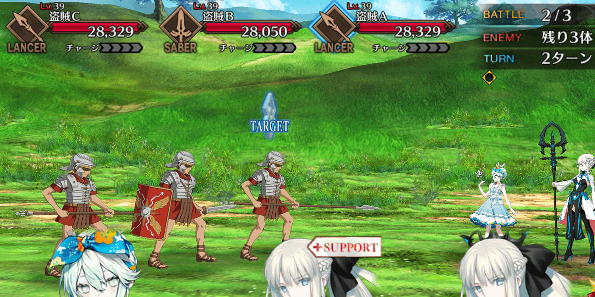 敵はセイバーとランサーの混成編成になっている。敵のHPは全体的に低いので、全体攻撃宝具持ちのバーサーカーで一掃しよう。