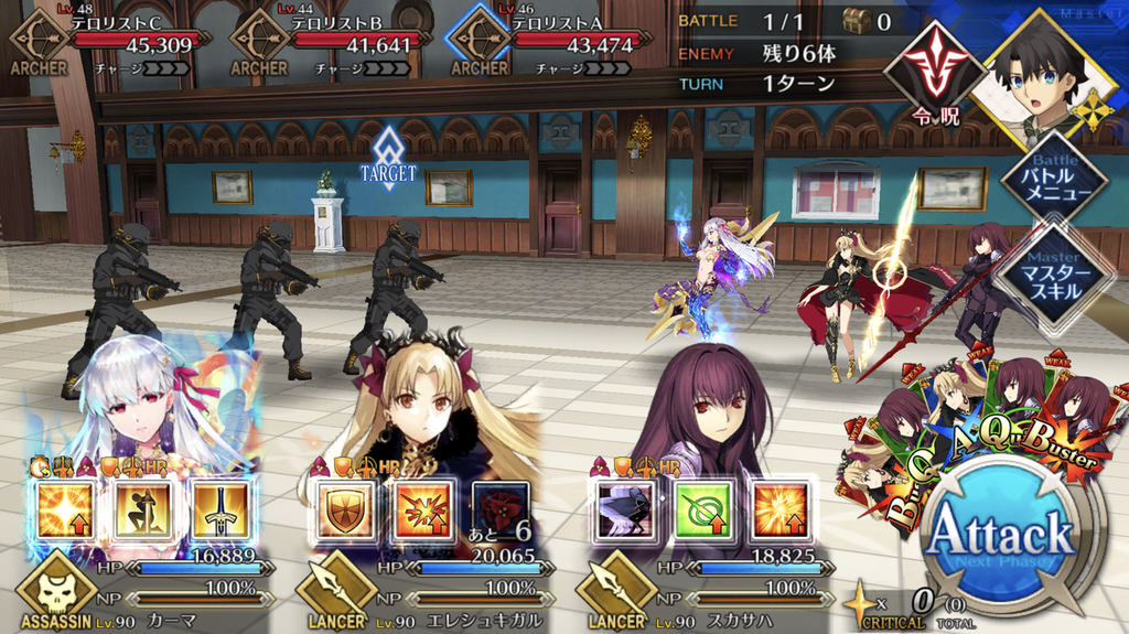 | 戦闘開始時、カーマに永続解除不可バフ付与毎ターン自身のスキルCTを1進めるNP獲得量アップ |
