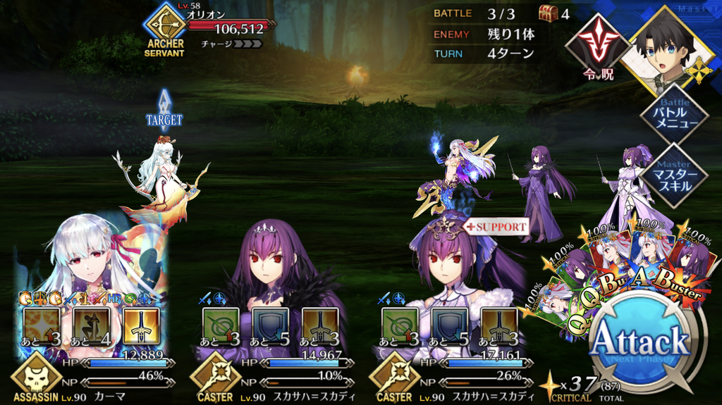 | 戦闘開始時、カーマに永続解除不可バフ付与毎ターン自身のスキルCTを1進めるNP獲得量アップ敵を倒した時にスター獲得 |
