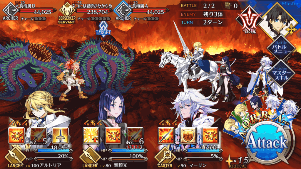 敵はアーチャーのエネミーと、ボスにバーサーカーのタマモキャットという構成。こちらはランサーを中心にパーティを組むと攻略しやすい。