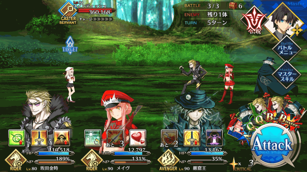 敵はキャスターのみなので、ライダーで固めた編成で挑もう。道中の敵は攻撃回数も少なく、3戦目までほとんど消耗することはない。3戦目までにNPを溜めて、宝具で一気に決着をつけよう。