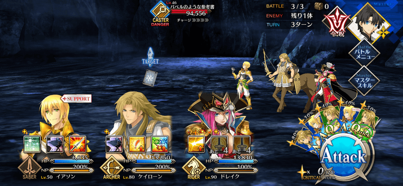 | ・編成制限:NPCイアソンをスタメン固定 ・ターン開始時、プレイヤー側全体にバフ付与 ┣2T:全体のNP100%増加&宝具威力アップ(1T) ┣3T:2T目と同じ ┗4T:2T目と同じ+イアソンのA性能アップ(1T) |