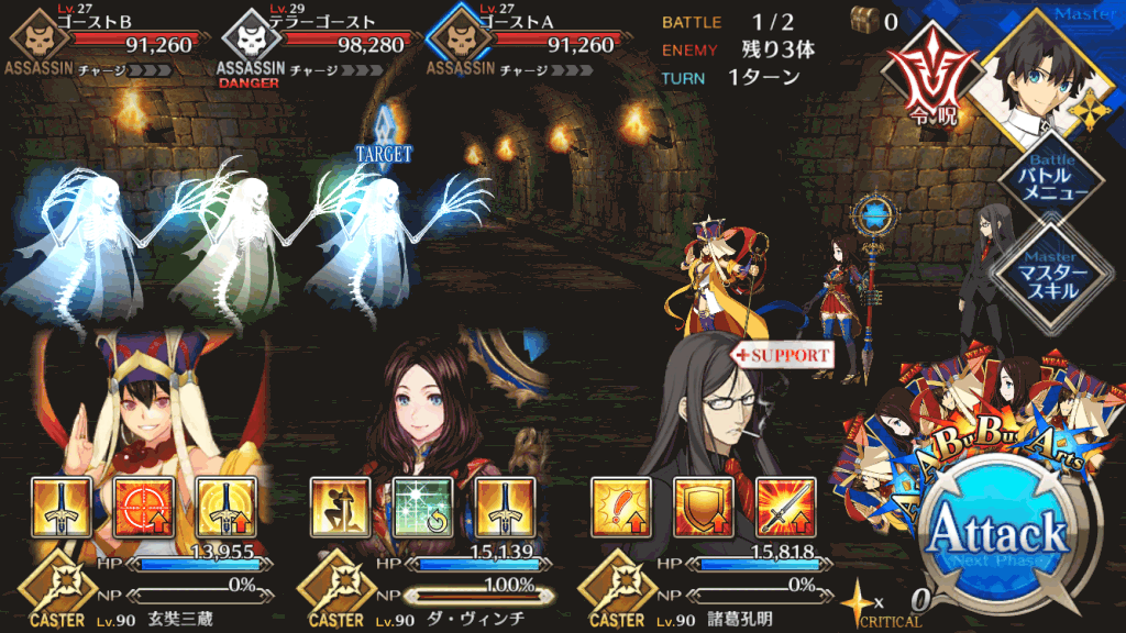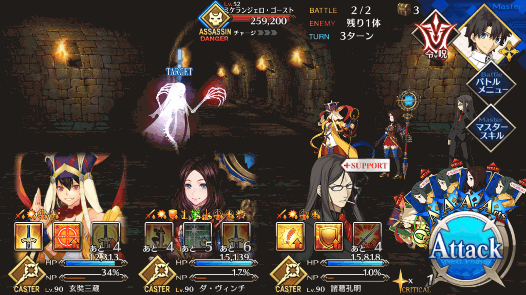 wave2はHP約26万のゴーストが相手。三蔵やイリヤといった高火力を出しやすい単体宝具キャスターも忘れずにパーティに組みこもう。