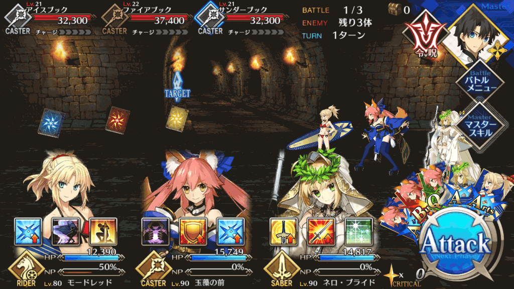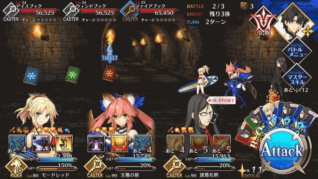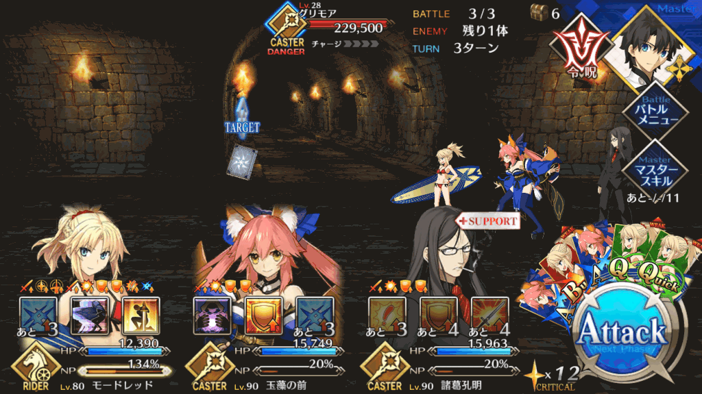 敵のクラスはキャスターしか出現しない為、こちらはライダーを中心に構成して挑むと非常に楽。wave3のグリモアがHPがかなり高めなので単体宝具持ちのライダーも1騎入れておくとwave3も楽になる。